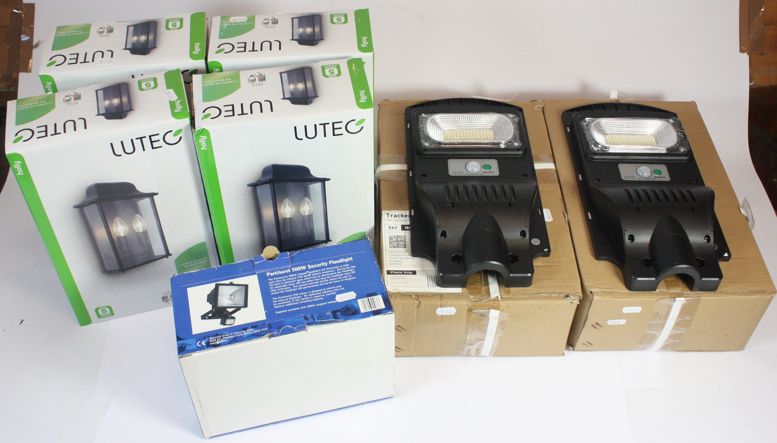 Lutec, 4 x Holly wall mounted outdoor lamps, unused, boxed, a 500w security lamp and a pair of Pecart solar street lamps, unused, boxed.