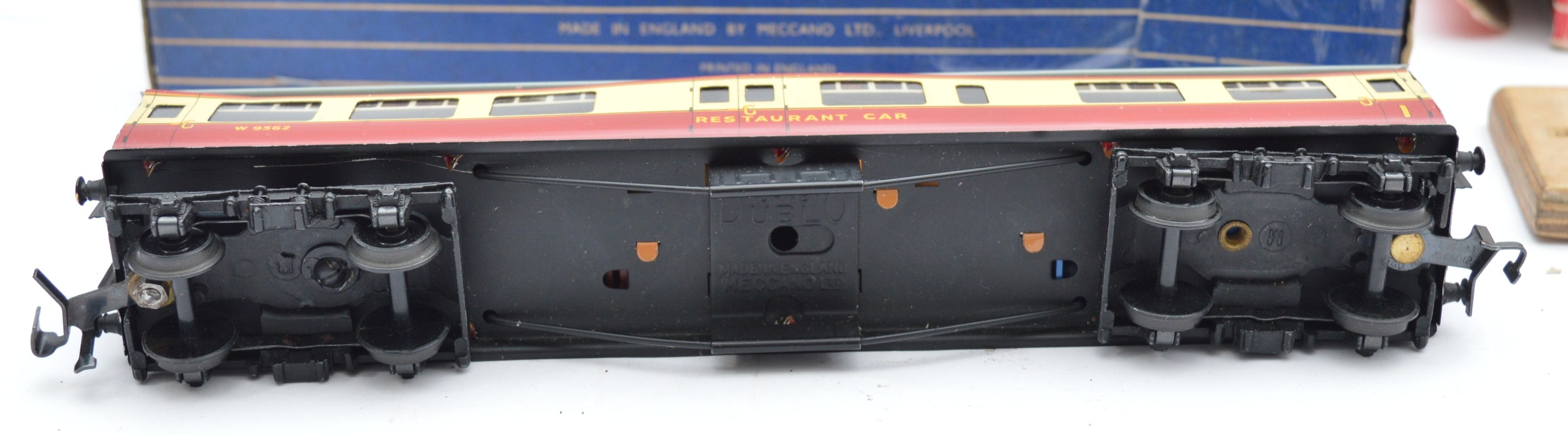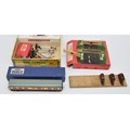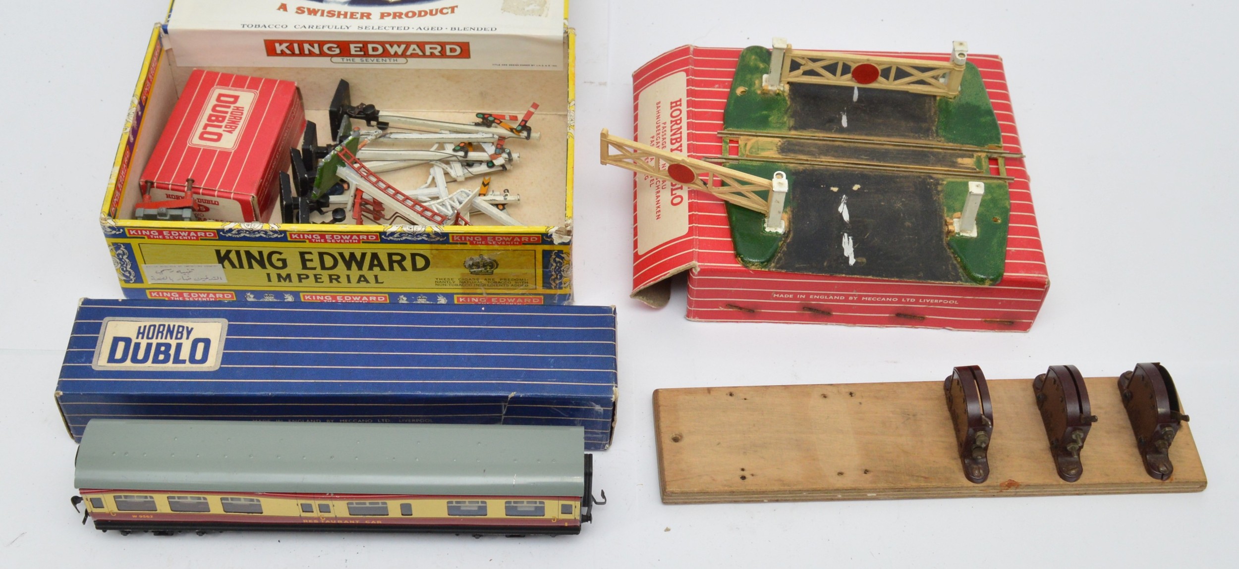 Box of sundry model railway items including Hornby Dublo coach (resturant car), a level crossing (both in original boxes) and 8 signal gantries.