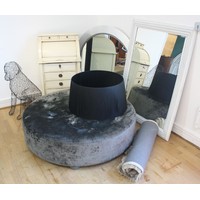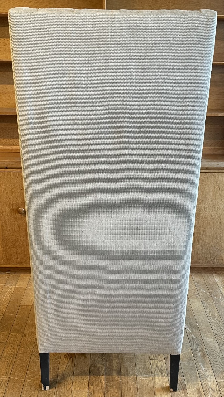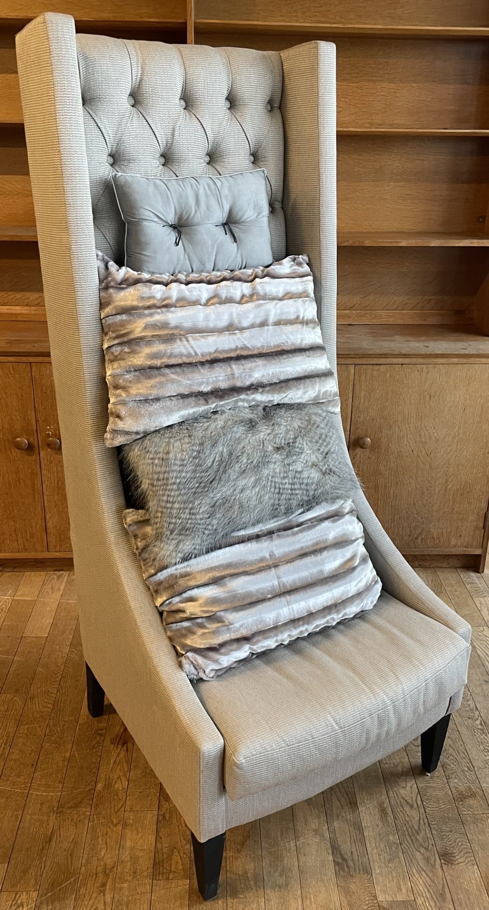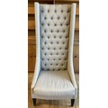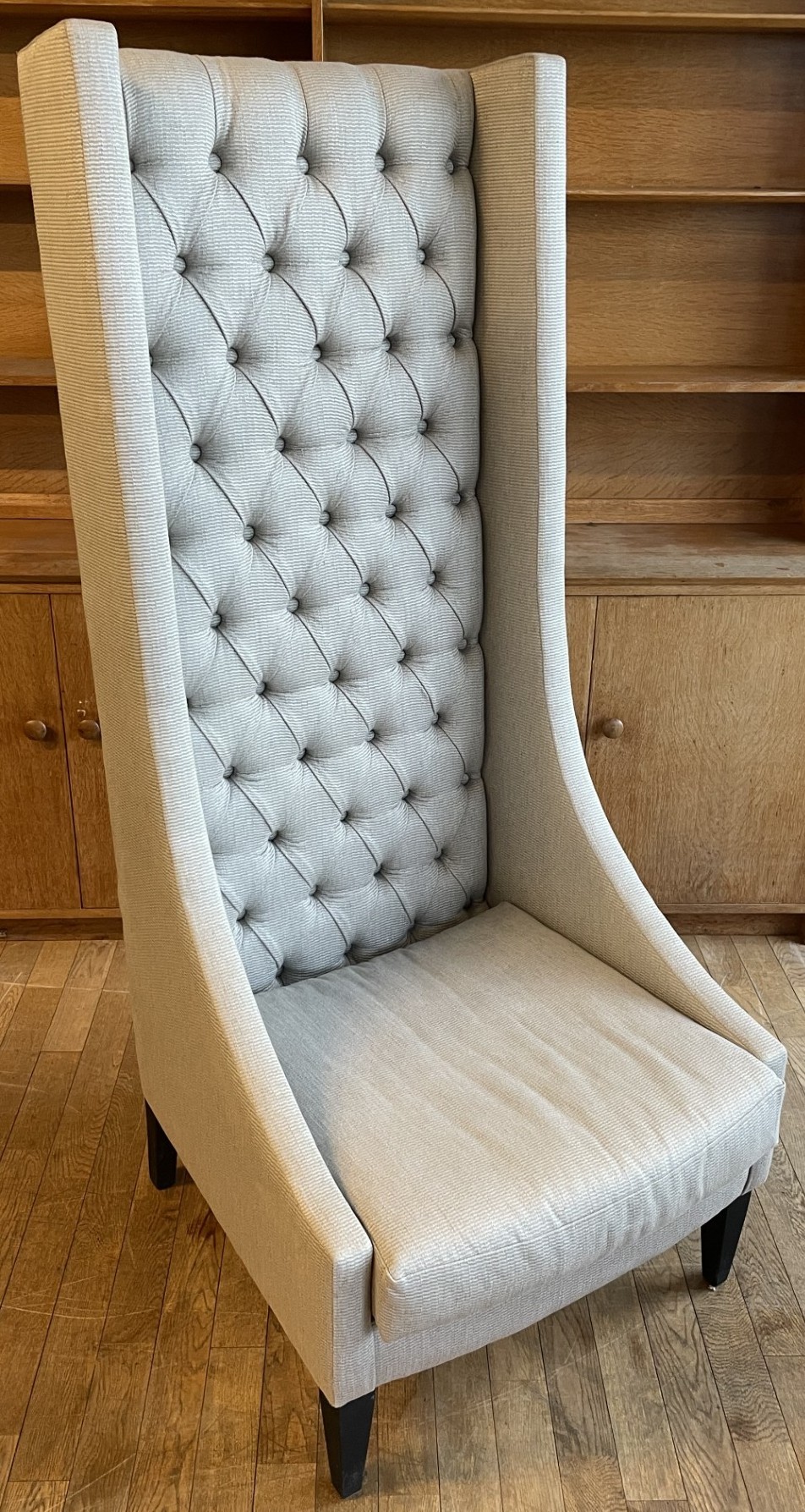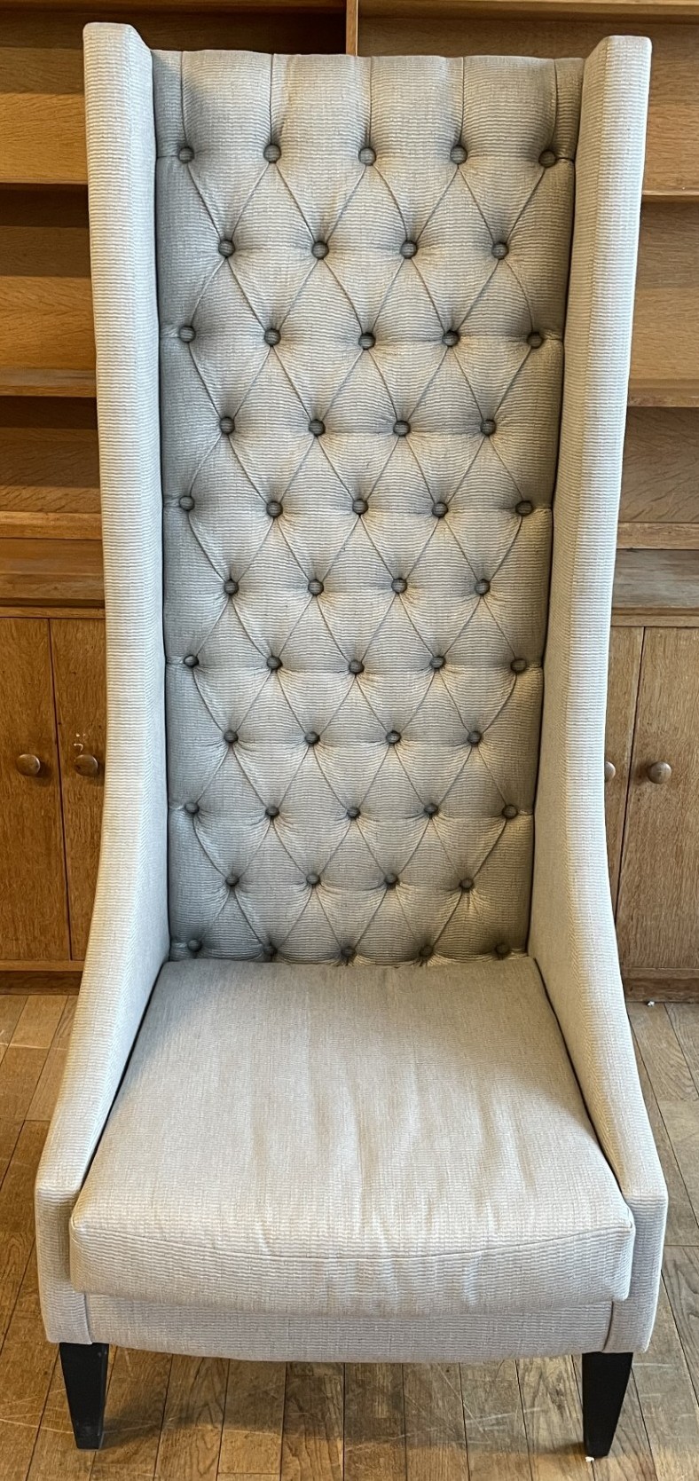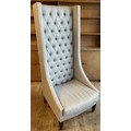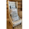 A contemporary Safavieh Mercer style bacall or porters chair, having high button back with shaped wing sides, cushioned seat in artic grey cotton blend fabric, on square fluted cherry wood legs, together with five scatter cushions, H160, W70, D65cm.