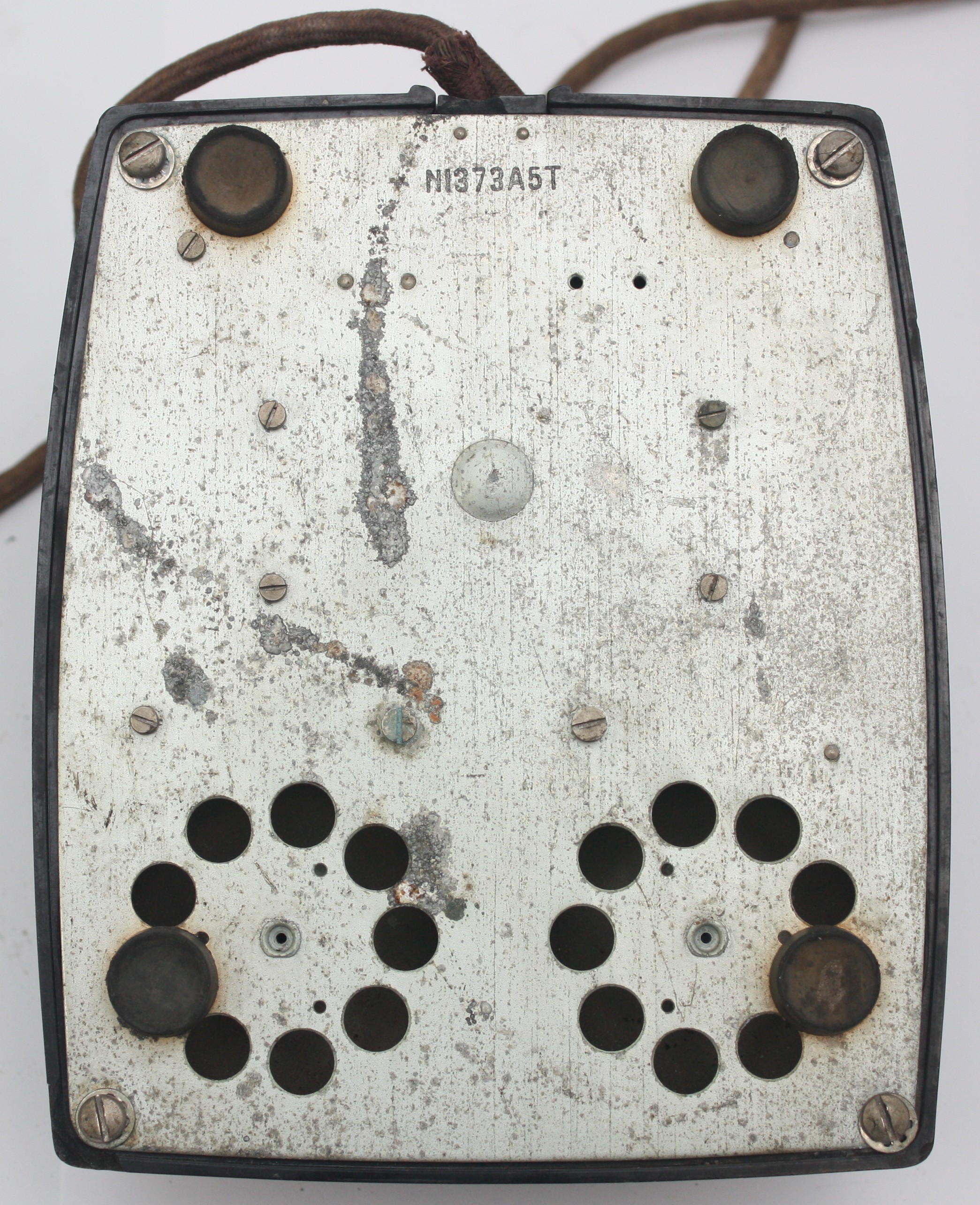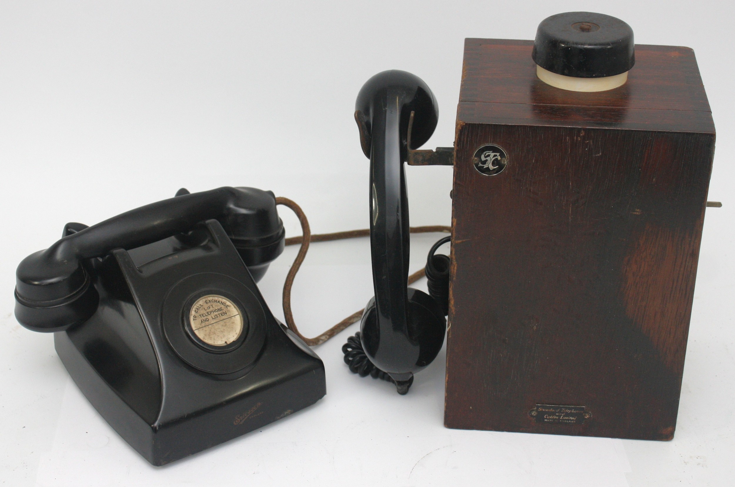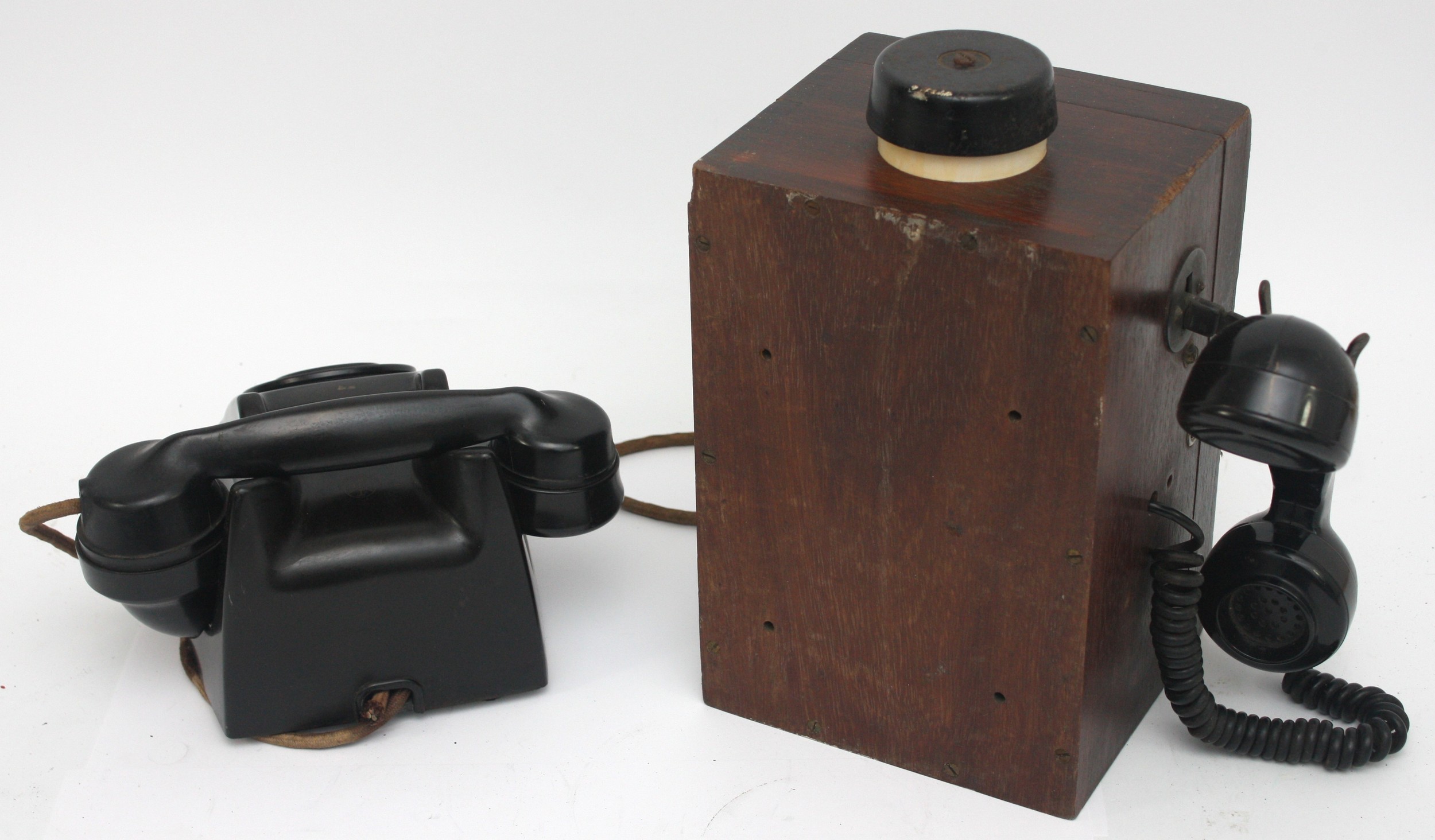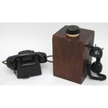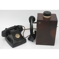 A wooden cased signal box shelf telephone and a black Bakelite internal office telephone- both with original internal wiring