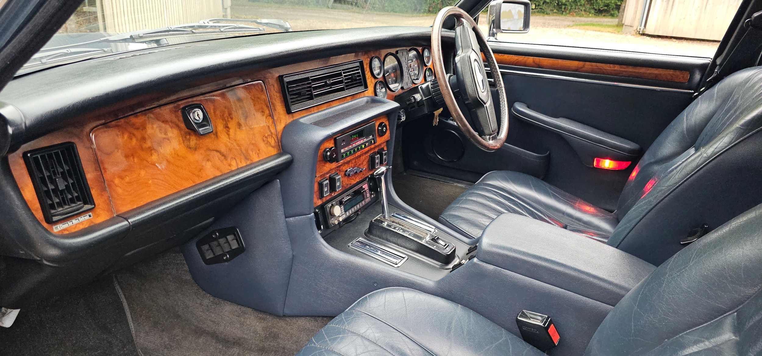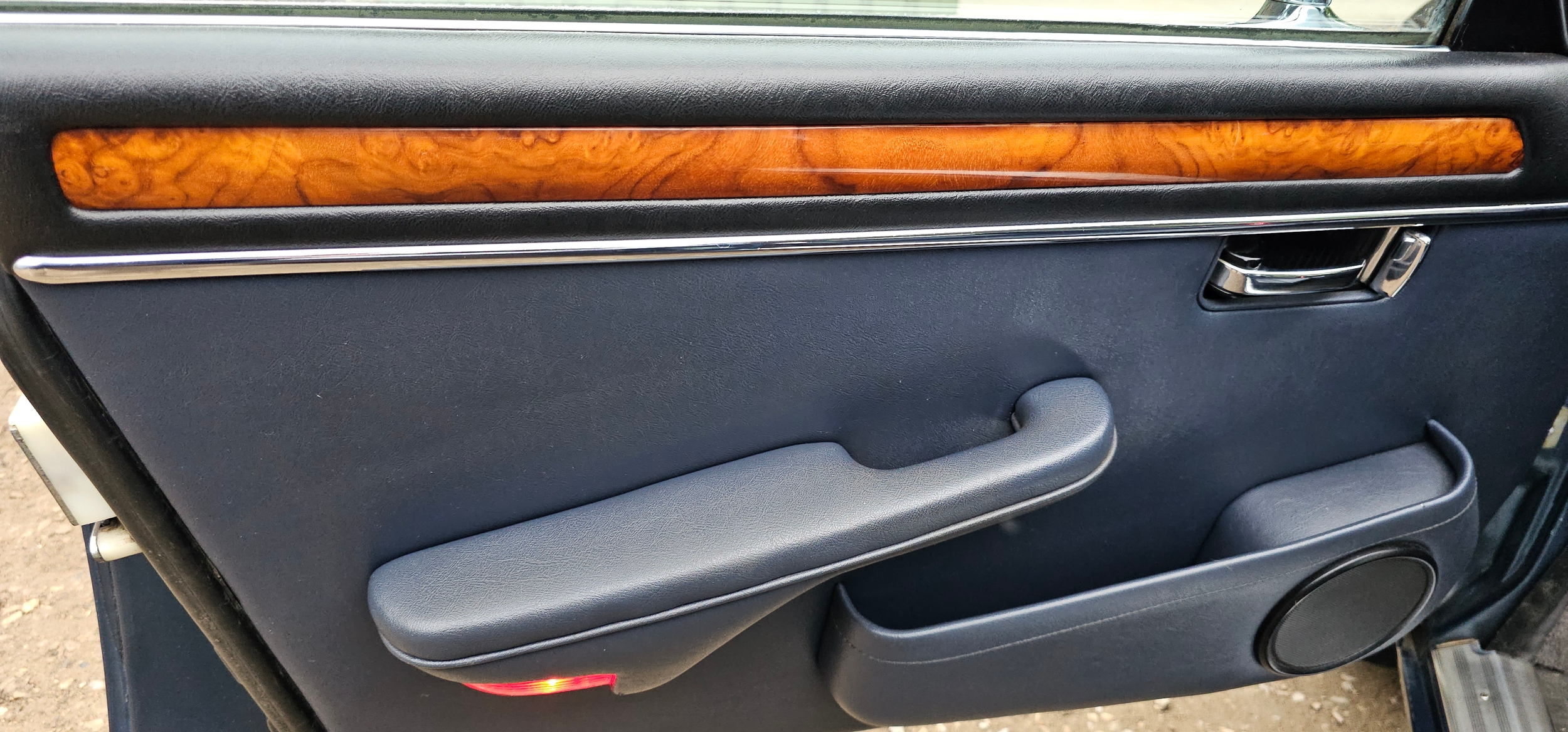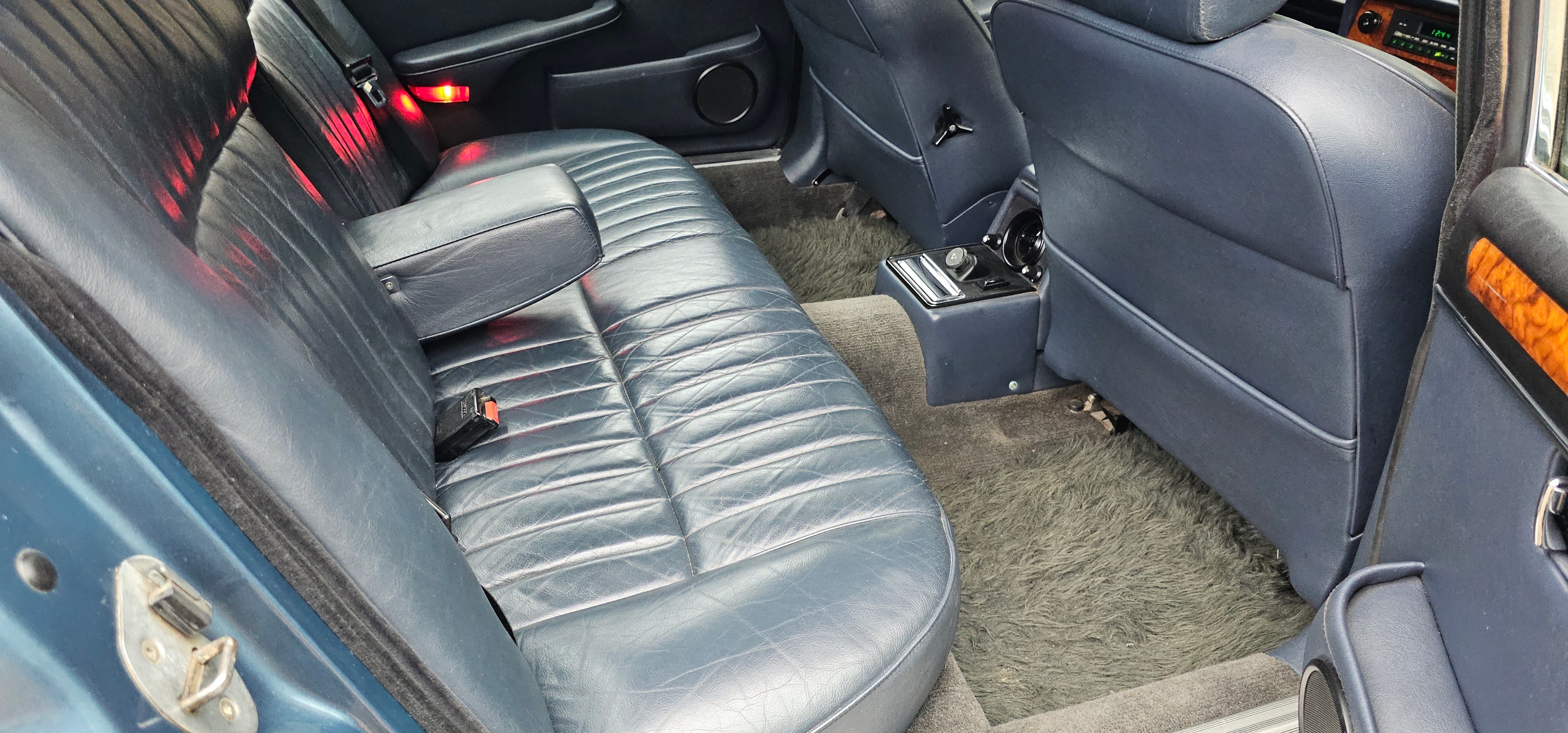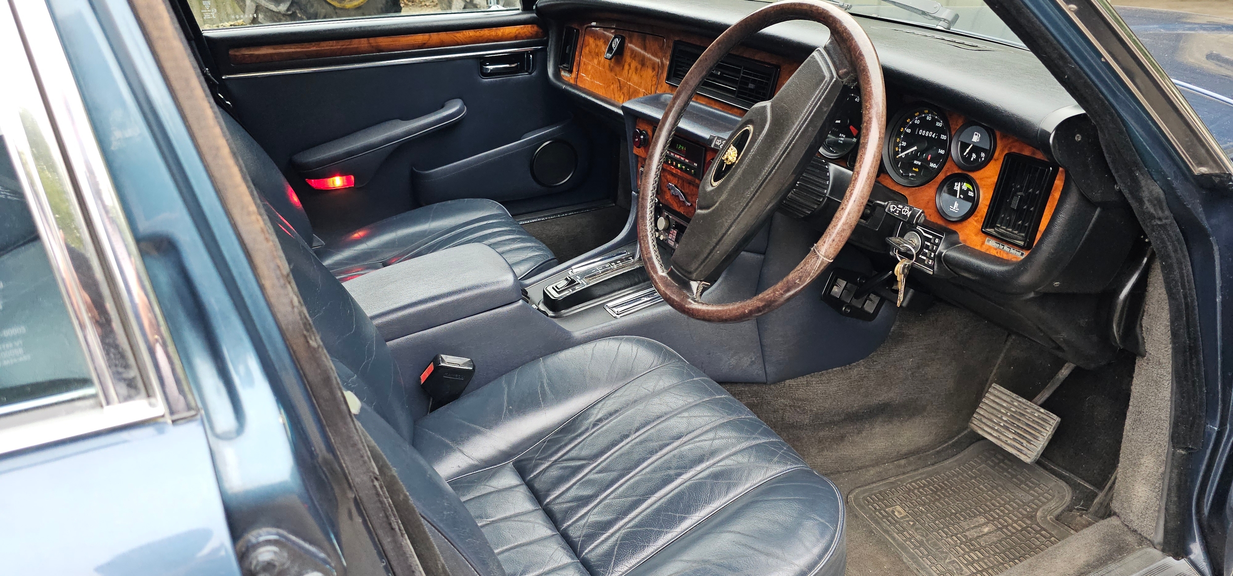 The interior is in very good condition, with unmarked blue leather. The dash, woodwork, carpets are all in fine condition. The chrome too is unblemished.