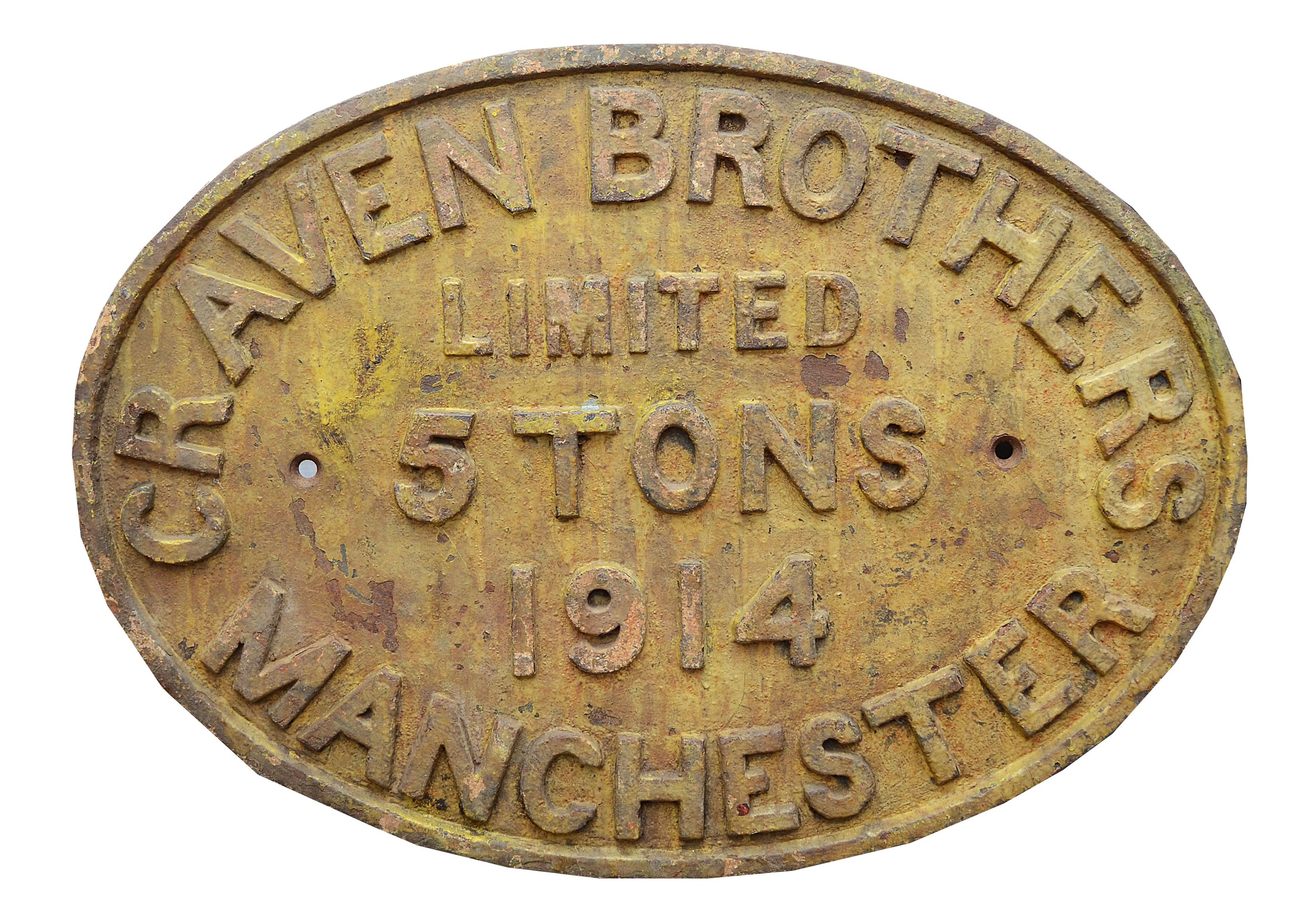 A round cast-iron railway crane makers plate - Craven Brothers Ltd. Manchester 1914 5 Tons, 58.5cm x 82.5.
