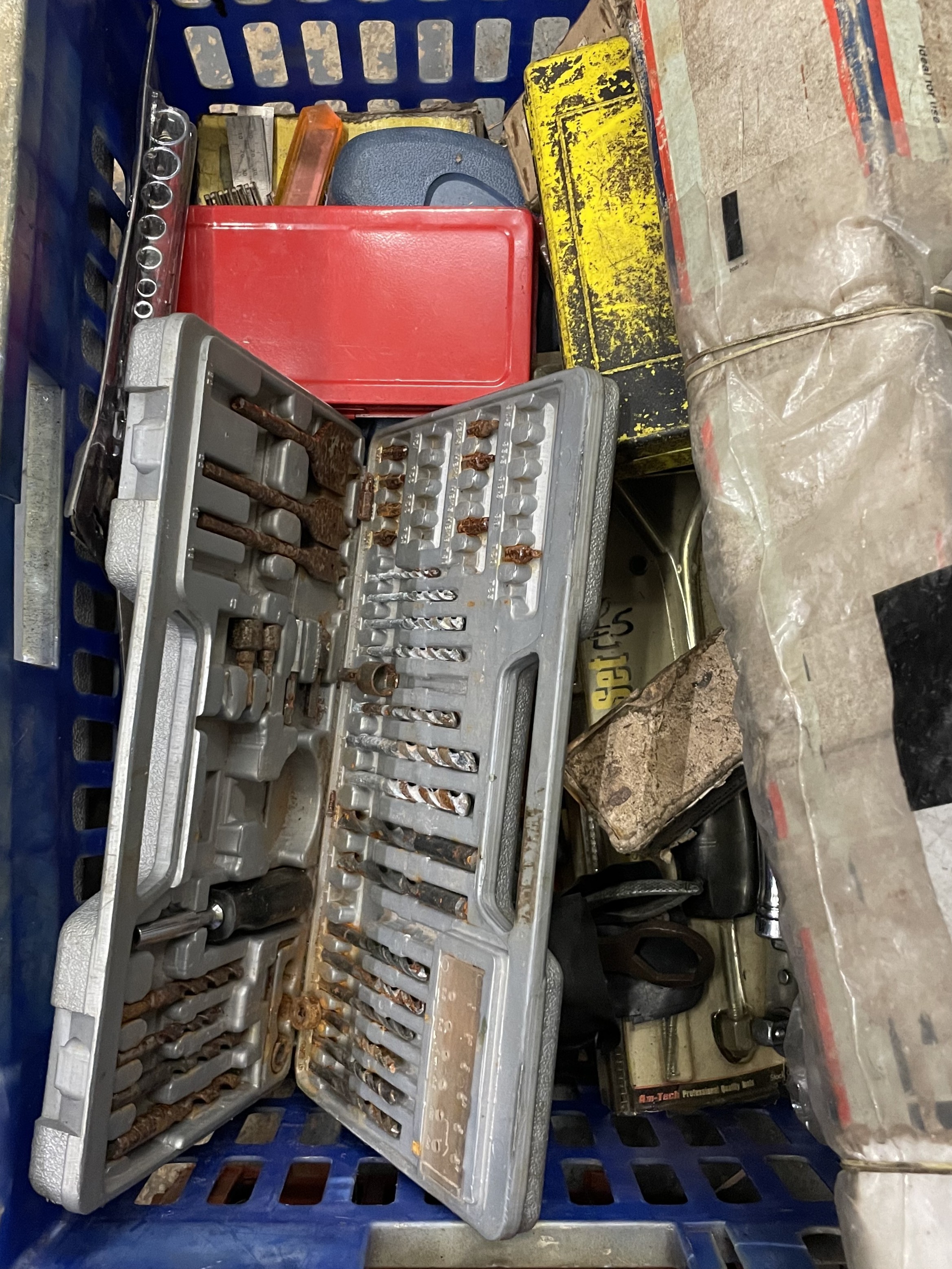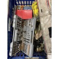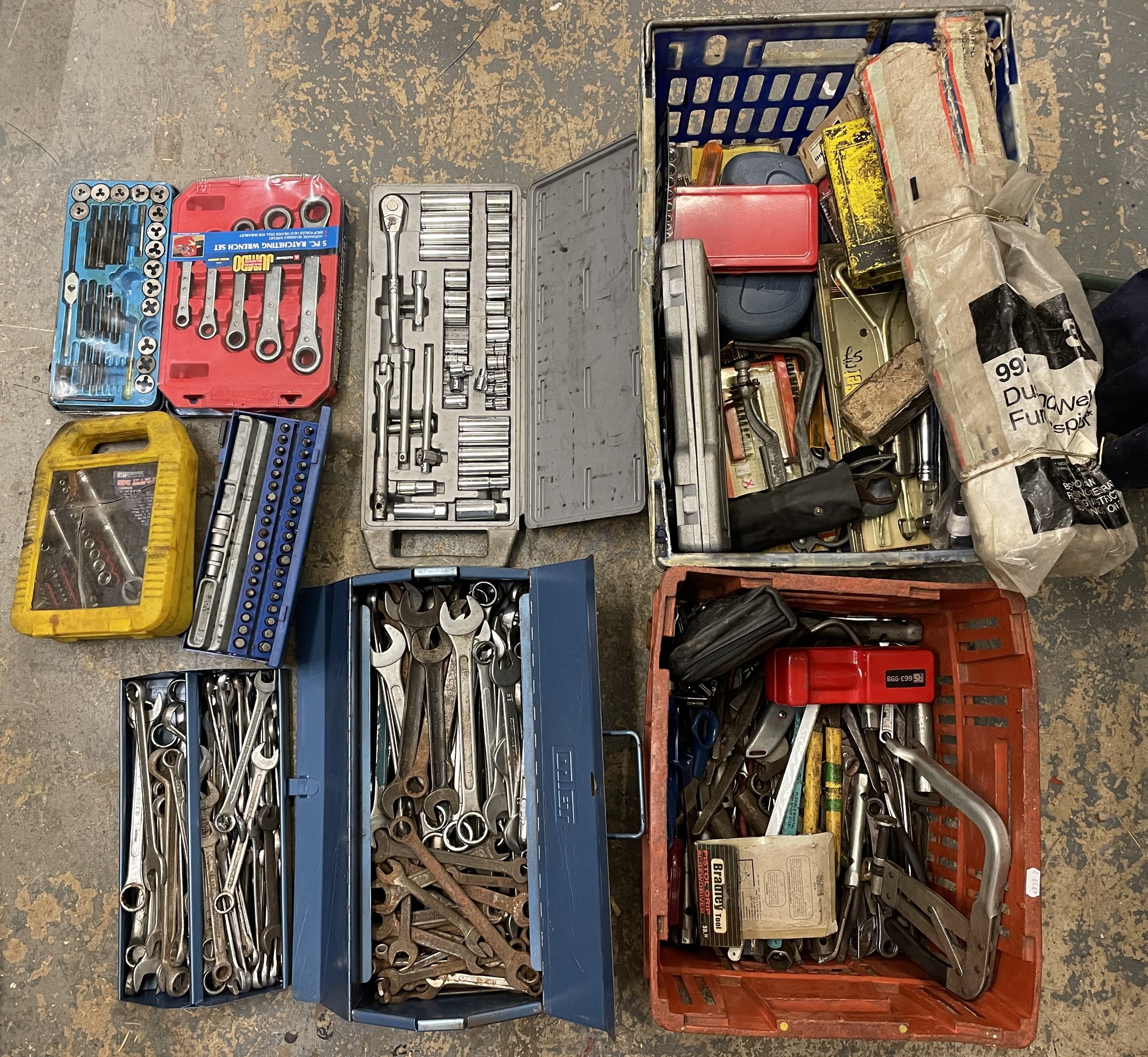 Two plastic crates and a blue talco tool box, containing mechanic's tools, spanners, torque wrenches, and socket sets. (3)