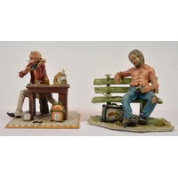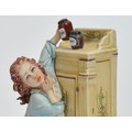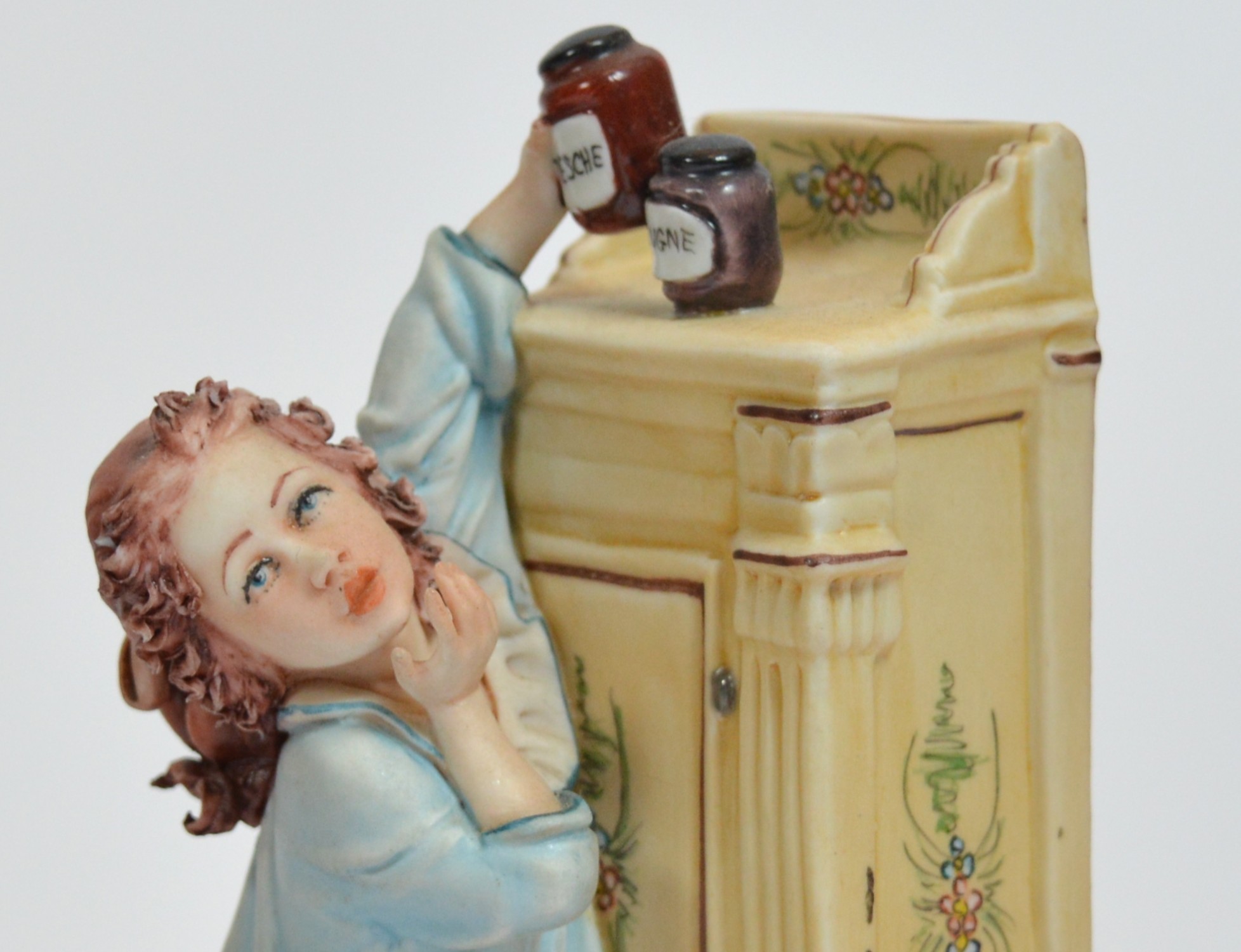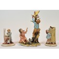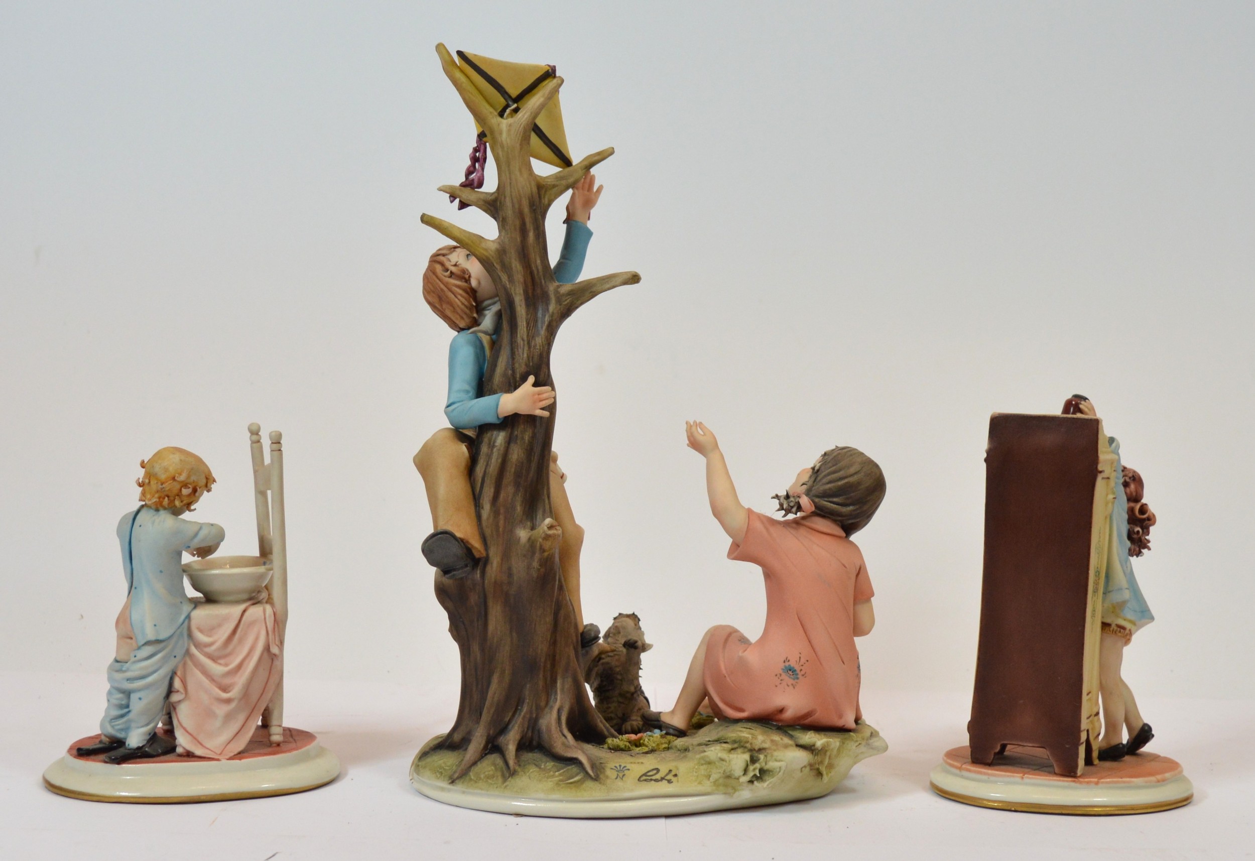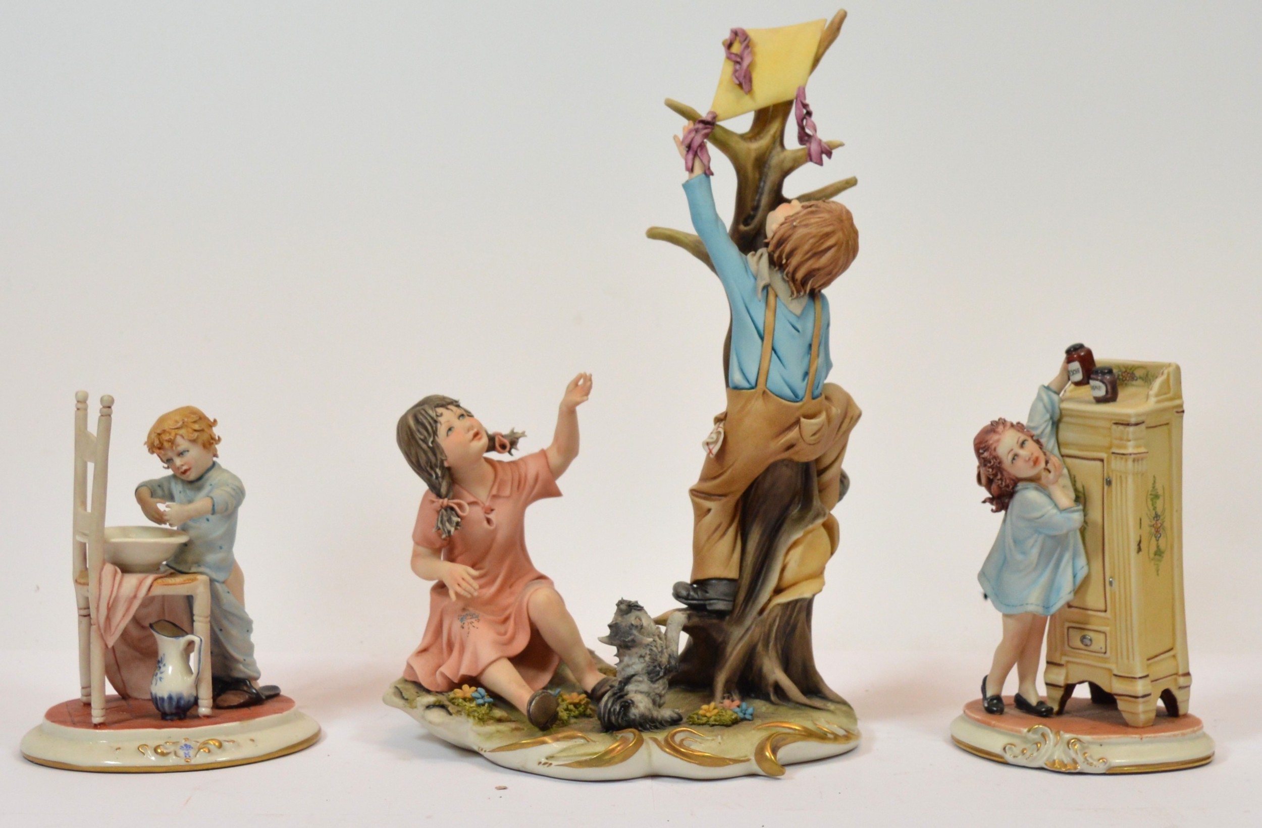 Capodimonte; three figural porcelain sculptures, depicting a young boy washing his hands, h. 14cm, a young girl sneaking a jar of peach jam, h. 15cm, and two adolescents retrieving a kite from a tree, h. 30cm. (3)