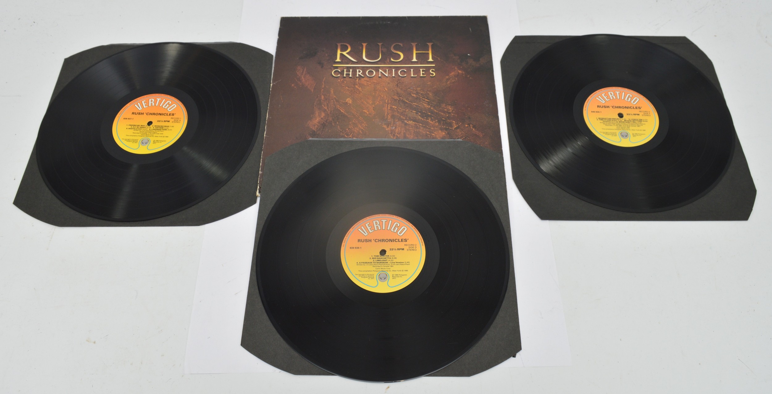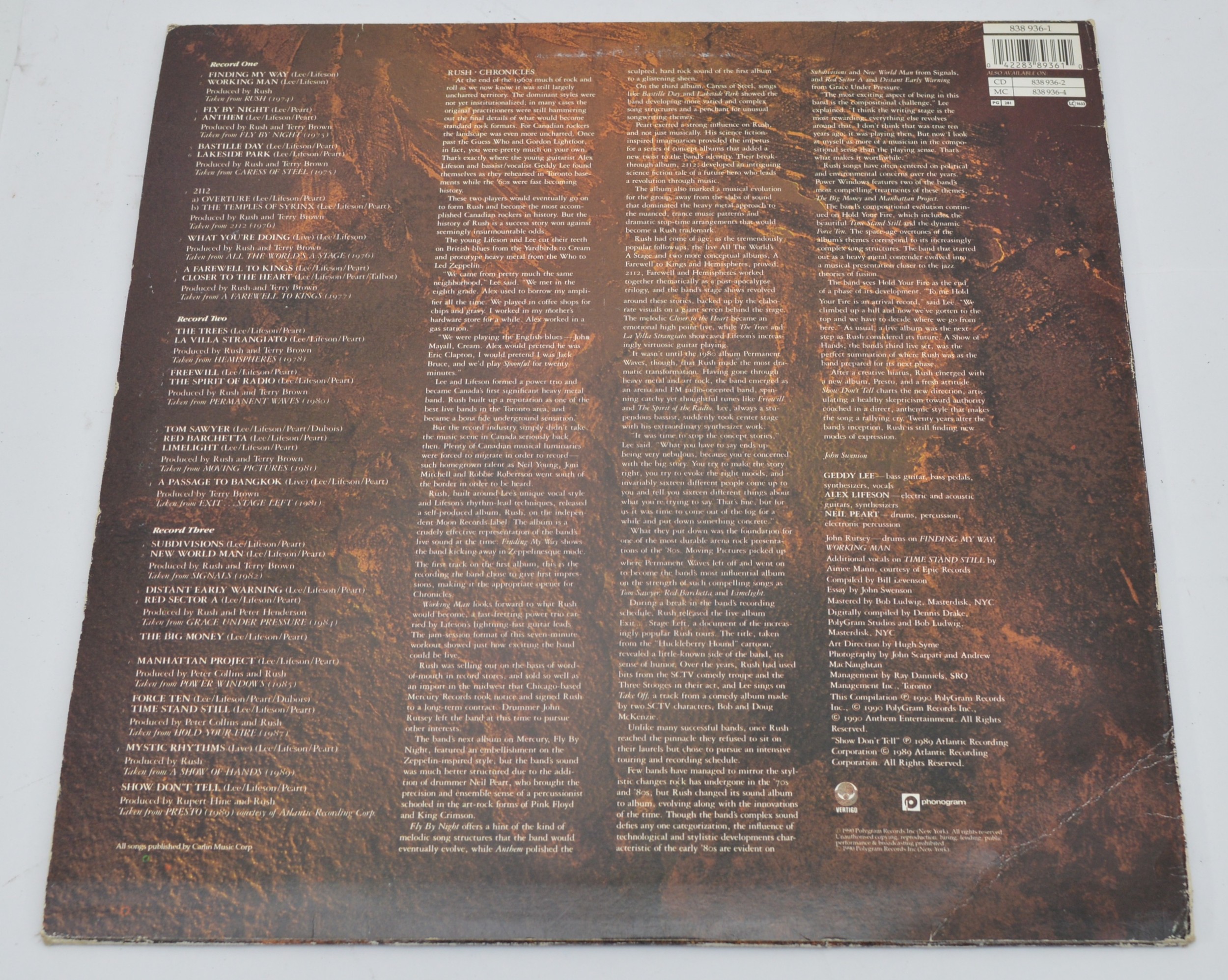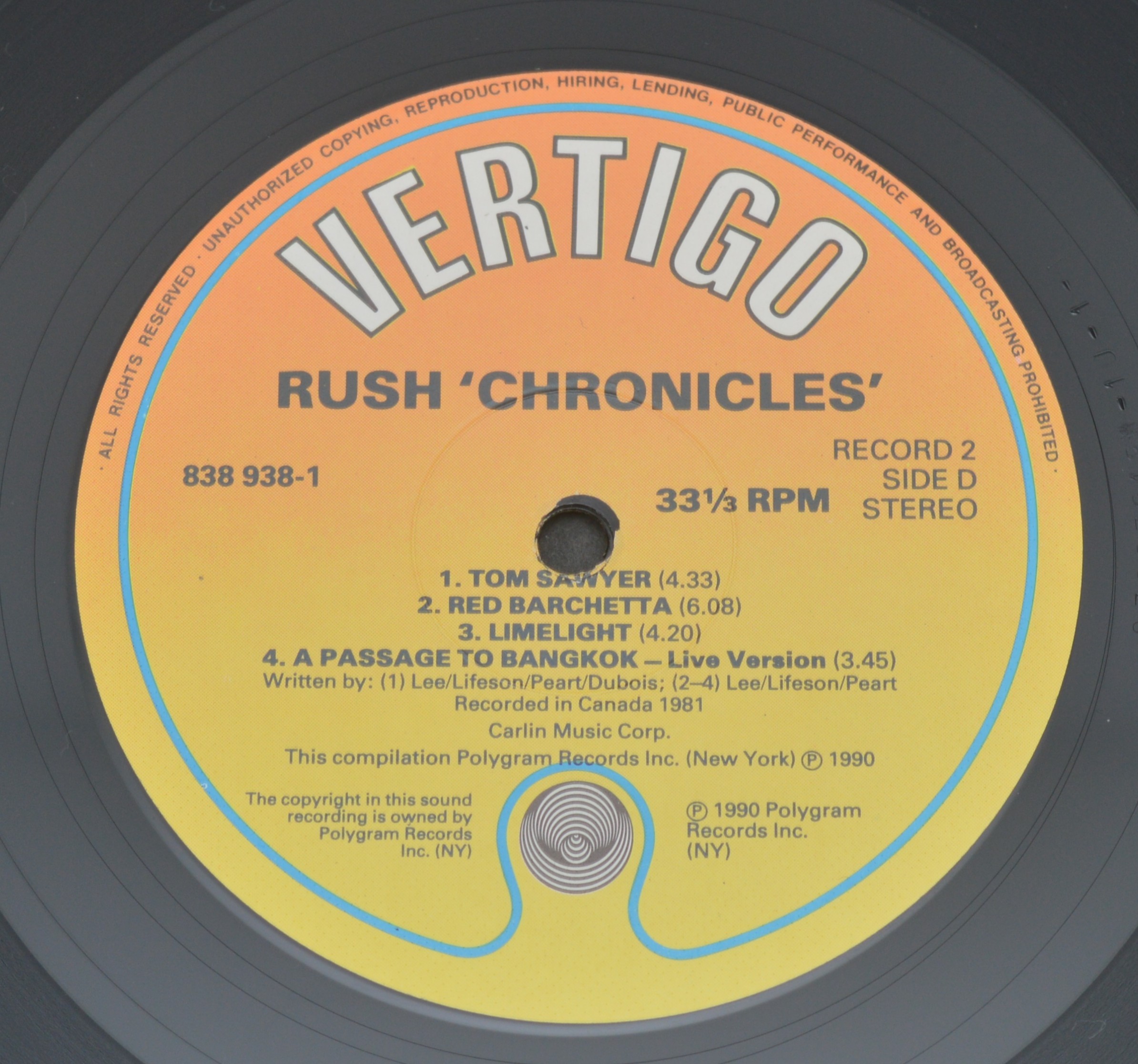 Rush, Chronicles 3xLP, Vertigo, original matrix code 838936-1 crossed out on record 1 and 3, restamped 846930-1, 838938-1 and 838937-1.