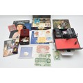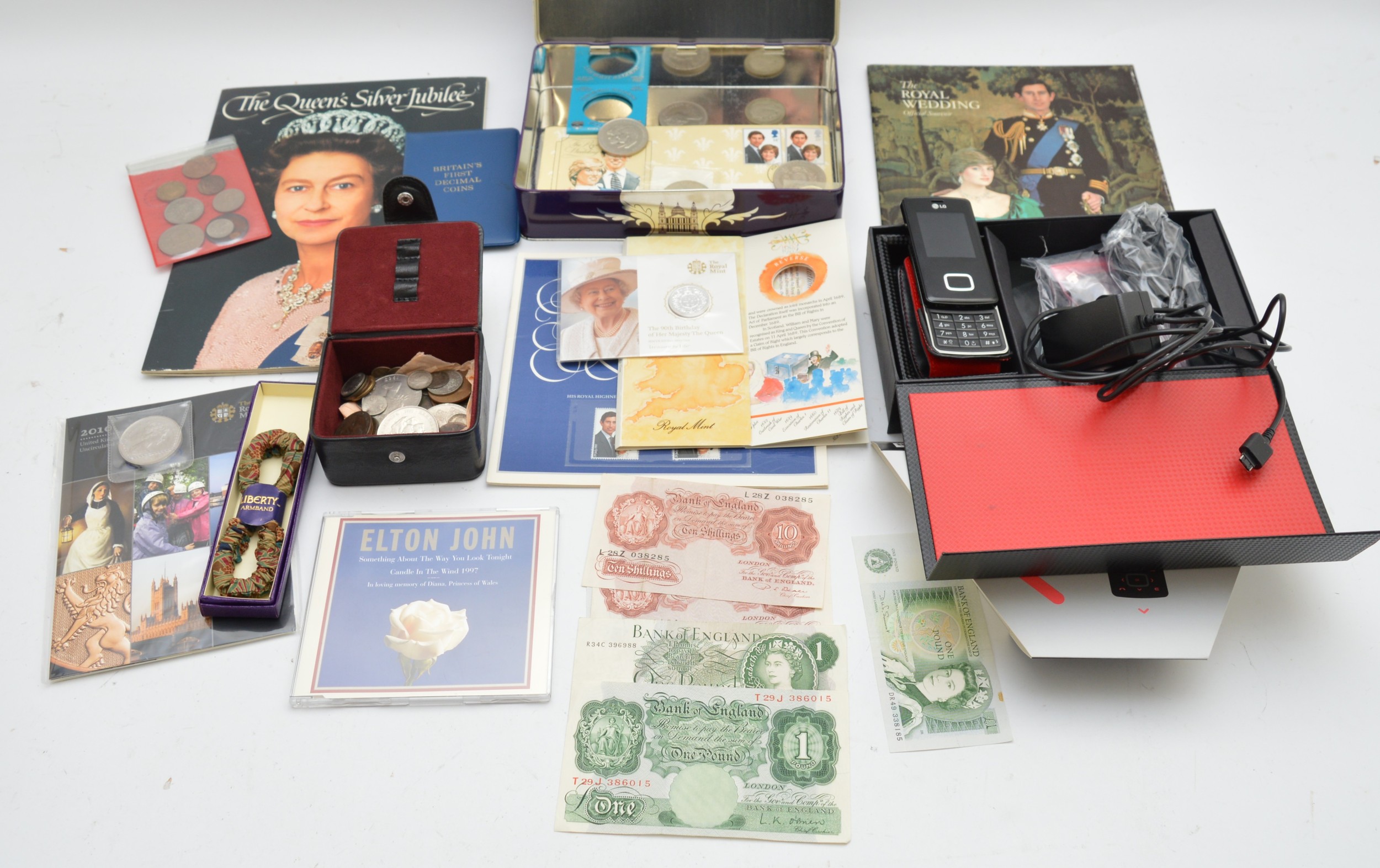 A LG KG800 chocolate slide action mobile telephone, with full accessory pack, Virgin network, an L.K. O'Brien £1 note, three other £1 notes, two 10 Shilling notes, Peppiatt and Beale, together with various commemorative and other coinage