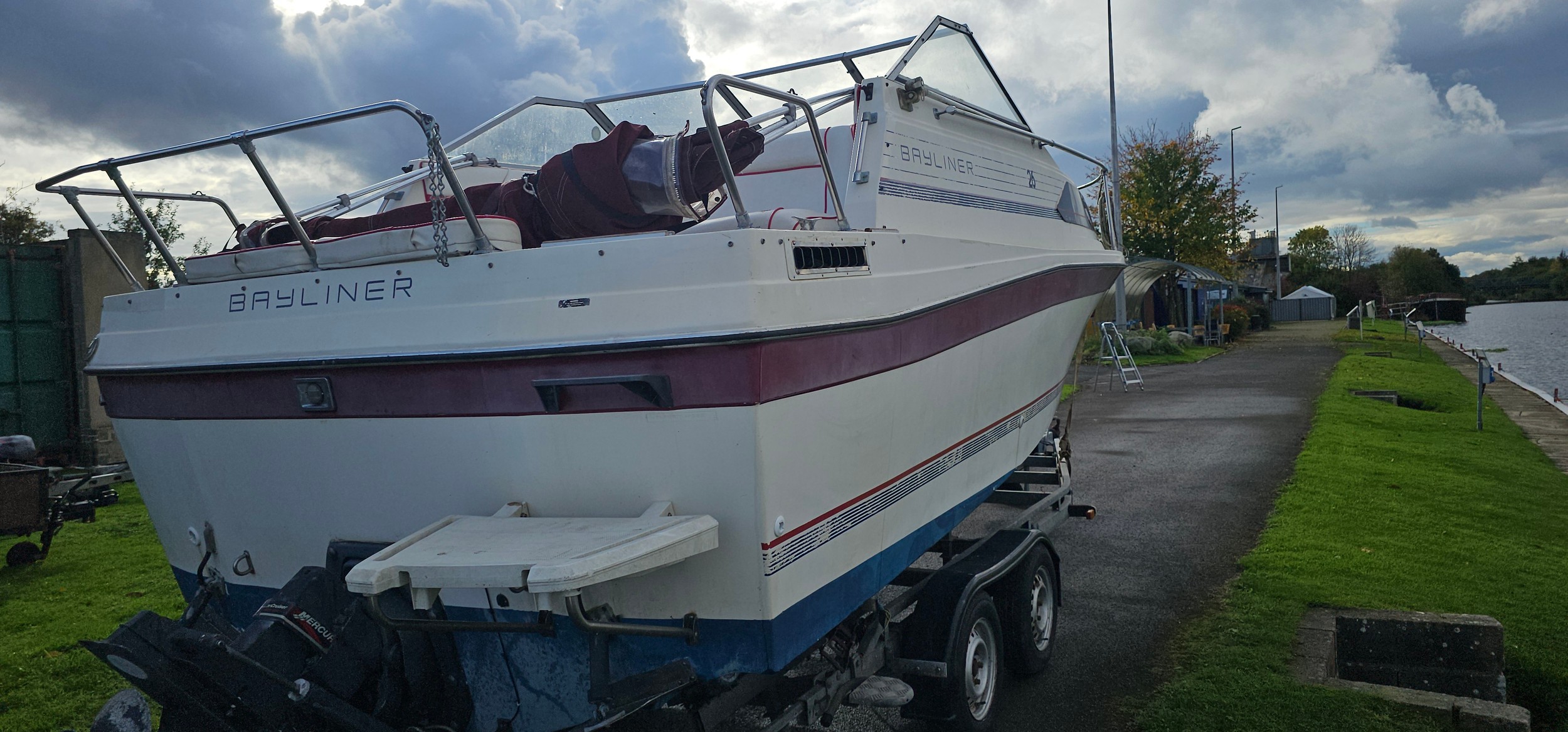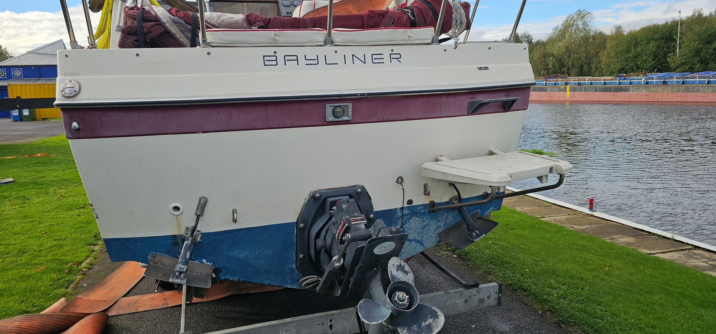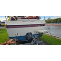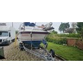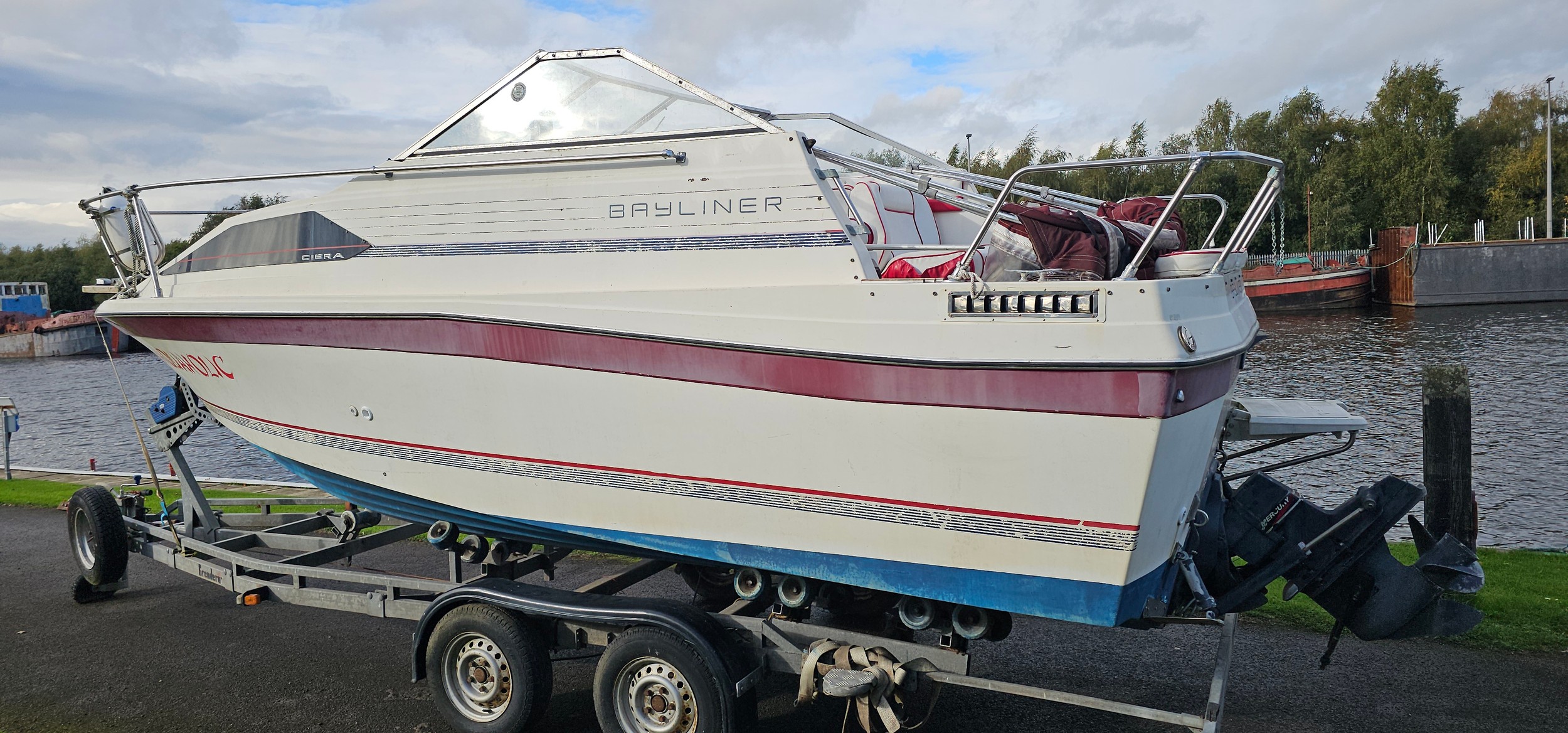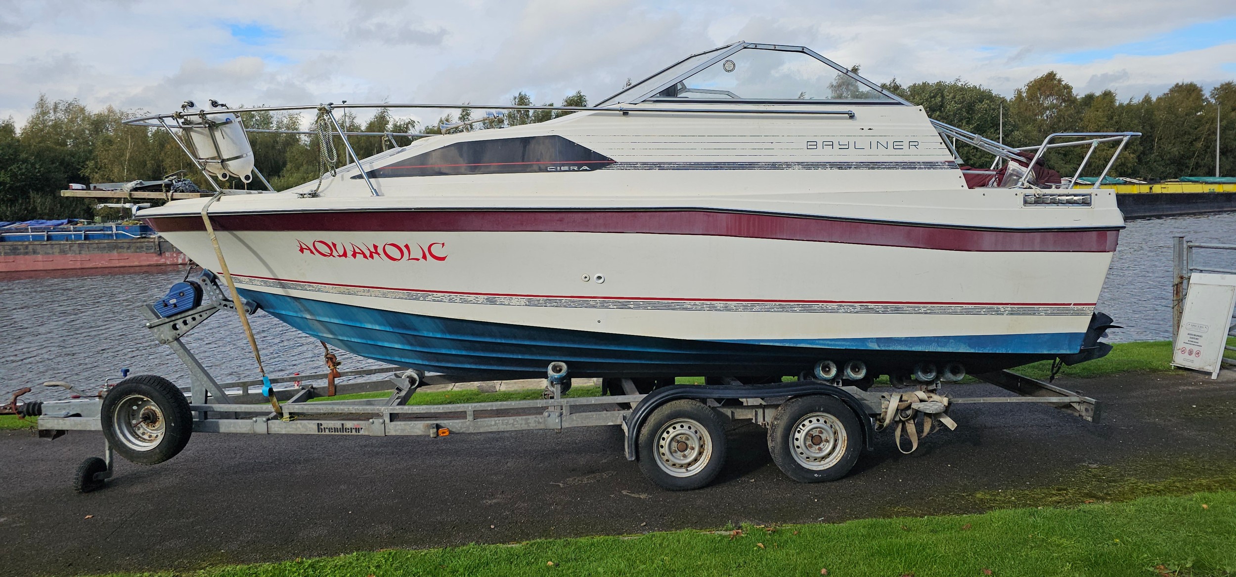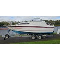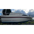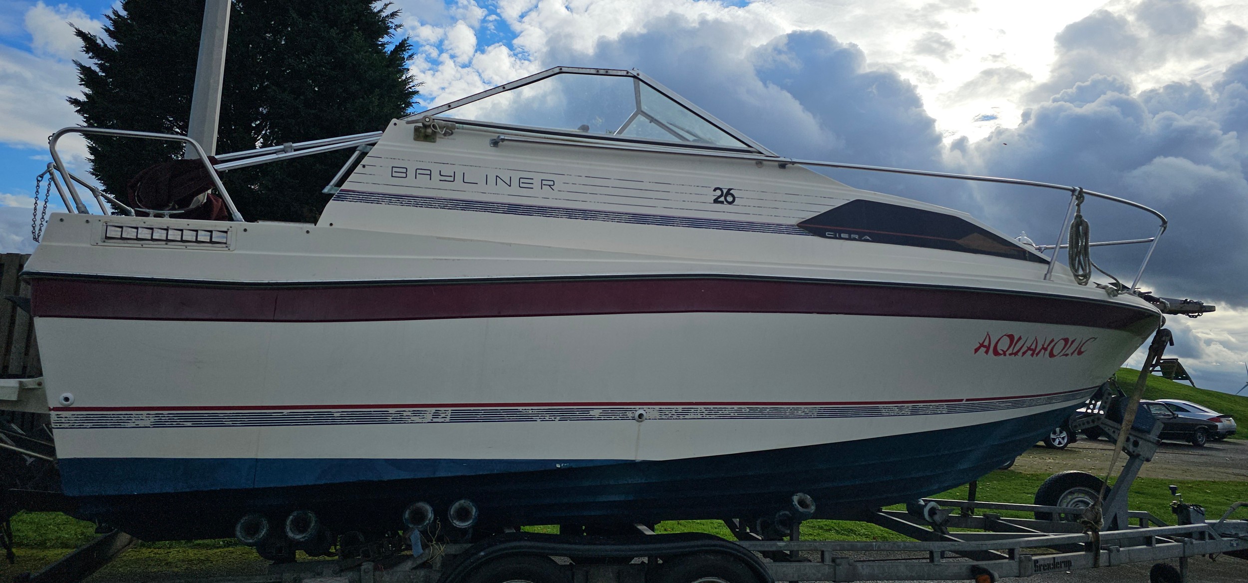 Bayliner Ciera 2655 cruiser, c.1985. Hull ID BL2B87SJA585. Four berth weekend cruiser. With inboard Mercruiser V8 engine and outdrive, 361 hours on the clock, cabin with sink facilities and heads, together with a Brenderup twin axle galvanised trailer, brakes disconnected.