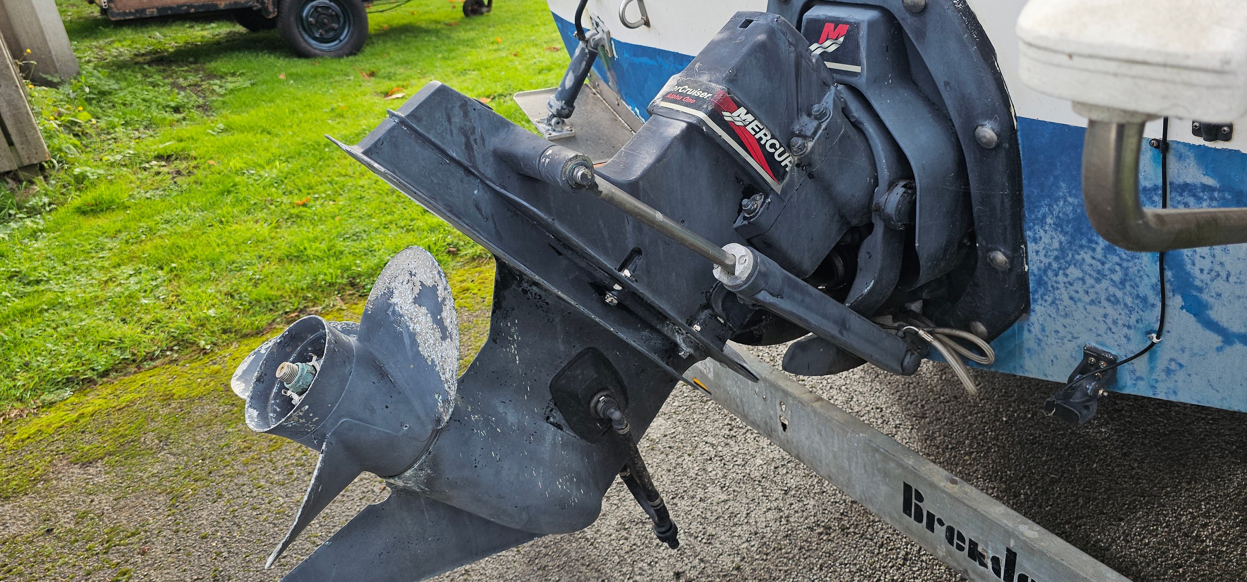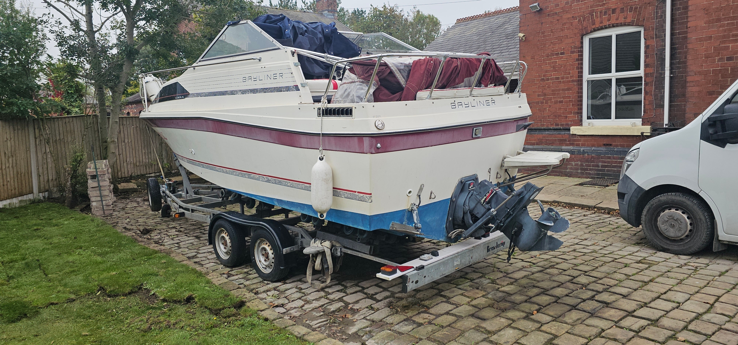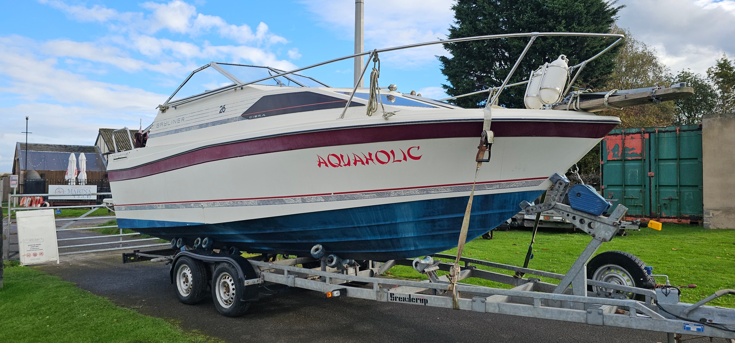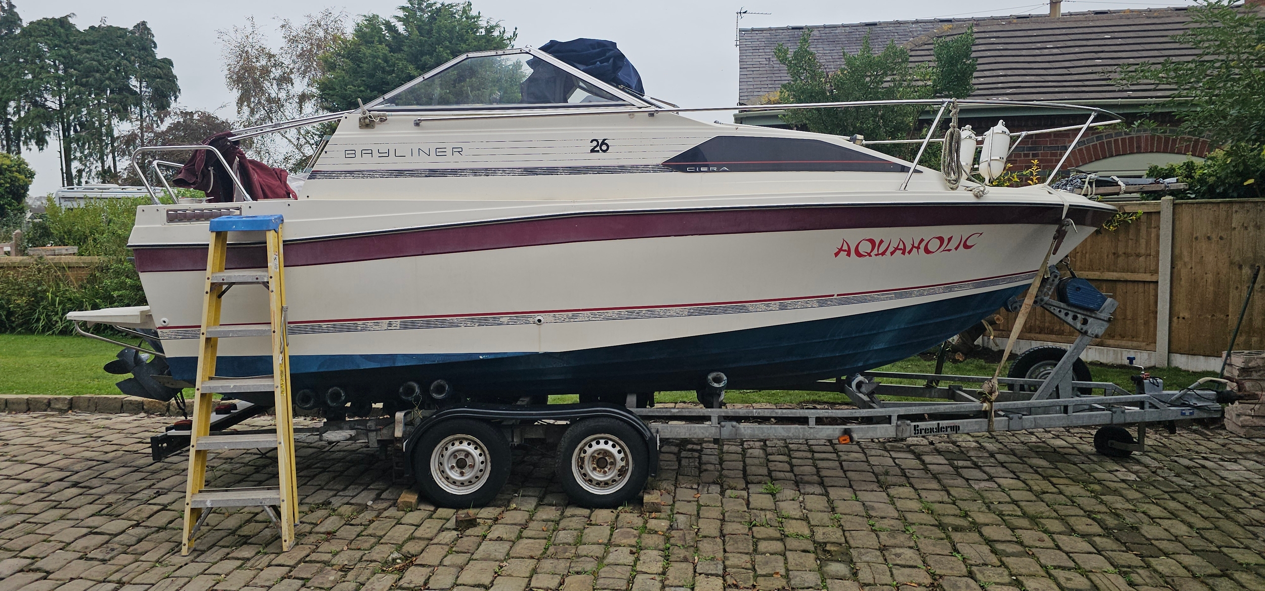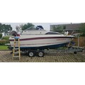 Bayliner Ciera 2655 cruiser, c.1985. Hull ID BL2B87SJA585. Four berth weekend cruiser. With inboard Mercruiser V8 engine and outdrive, 361 hours on the clock, cabin with sink facilities and heads, together with a Brenderup twin axle galvanised trailer, brakes disconnected.