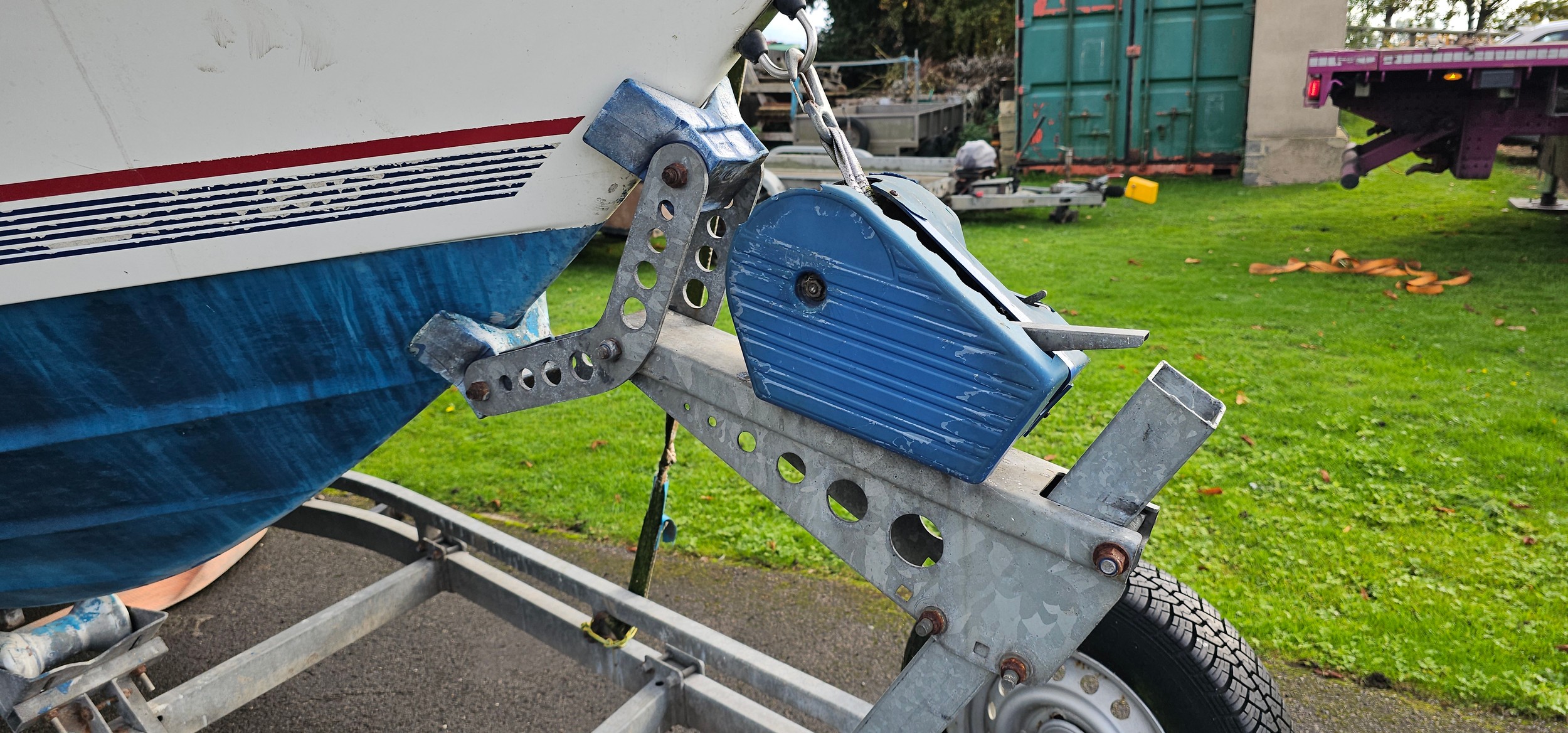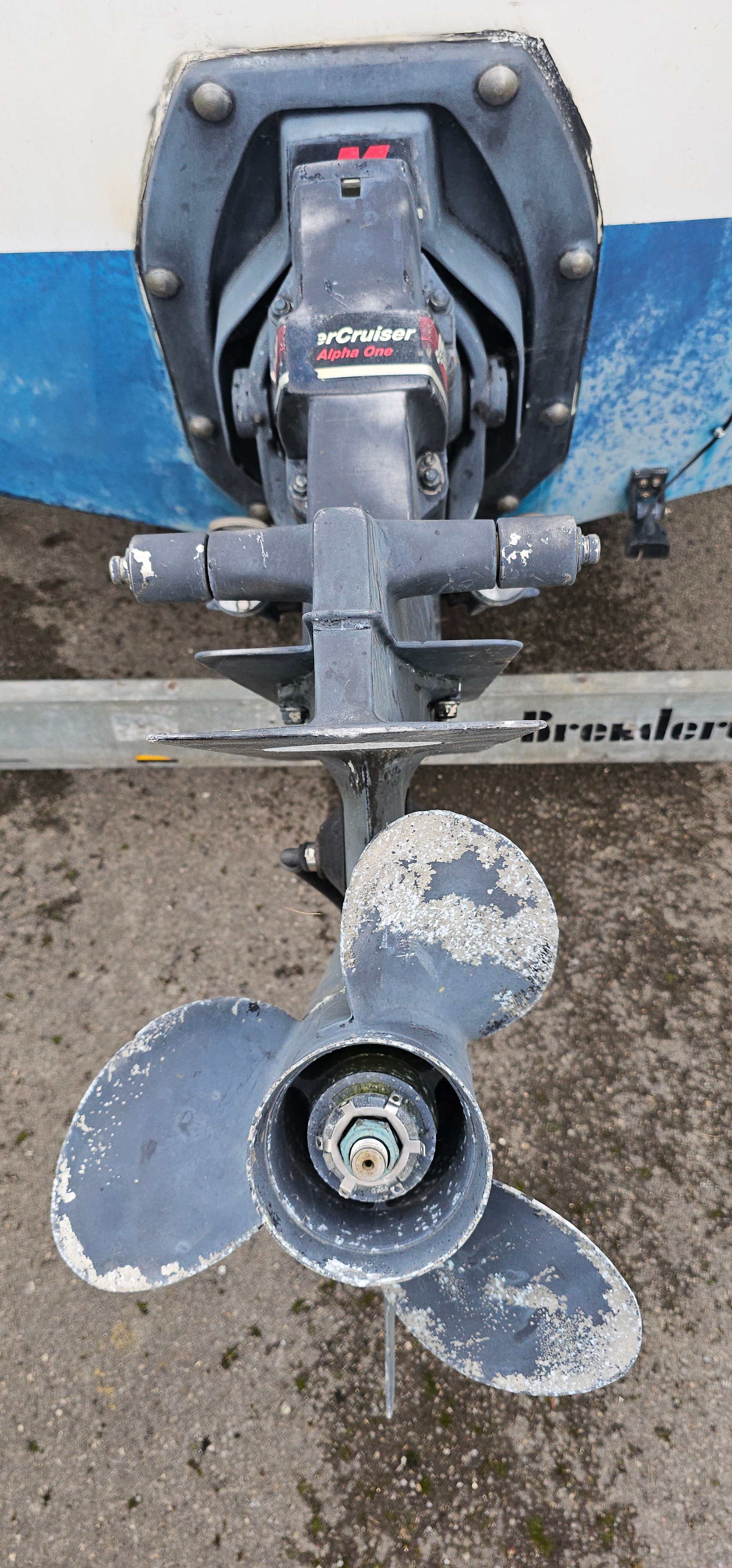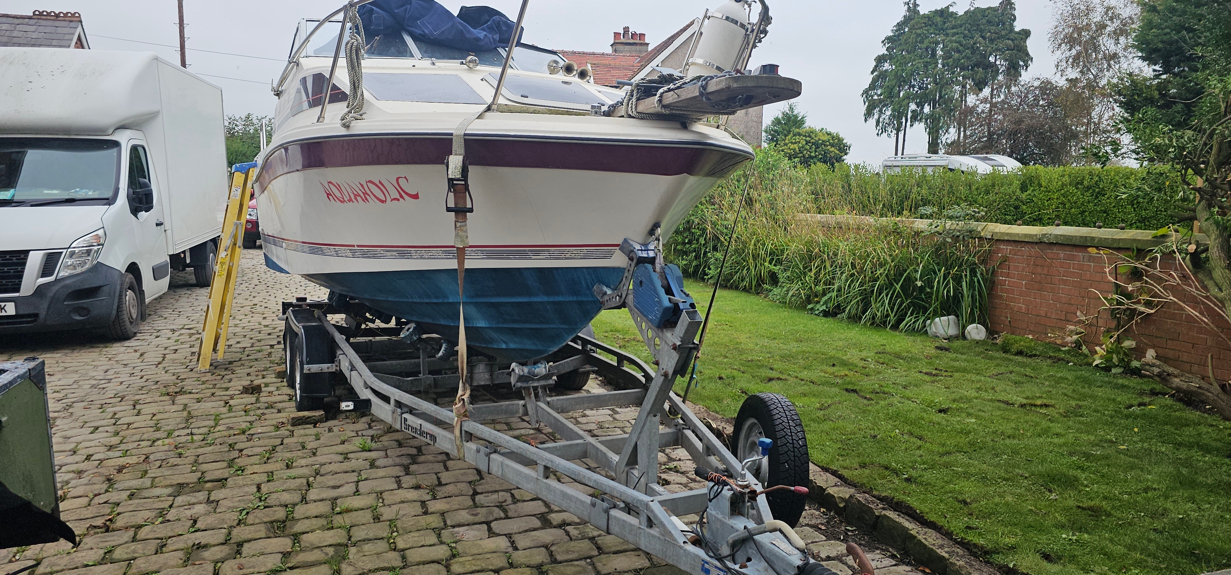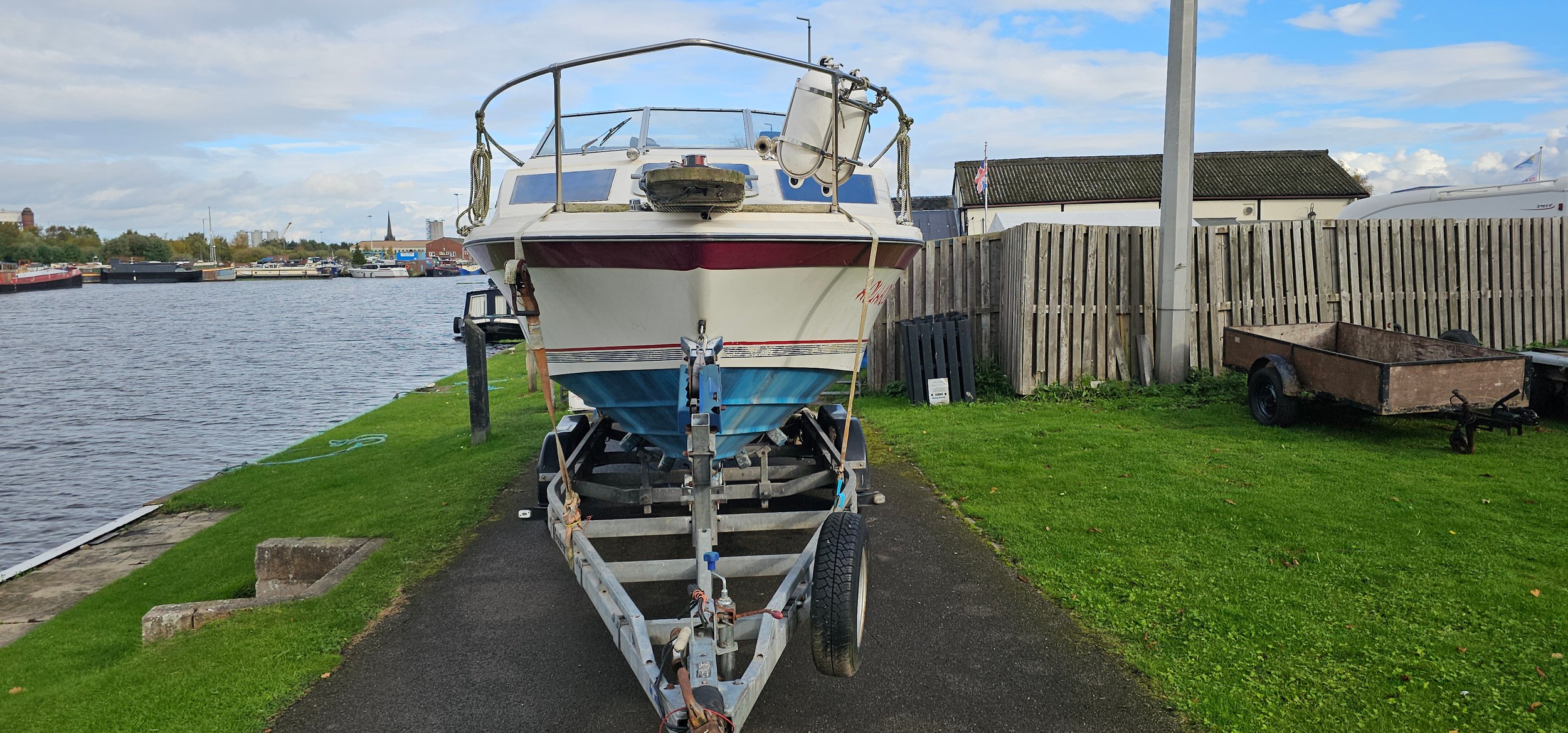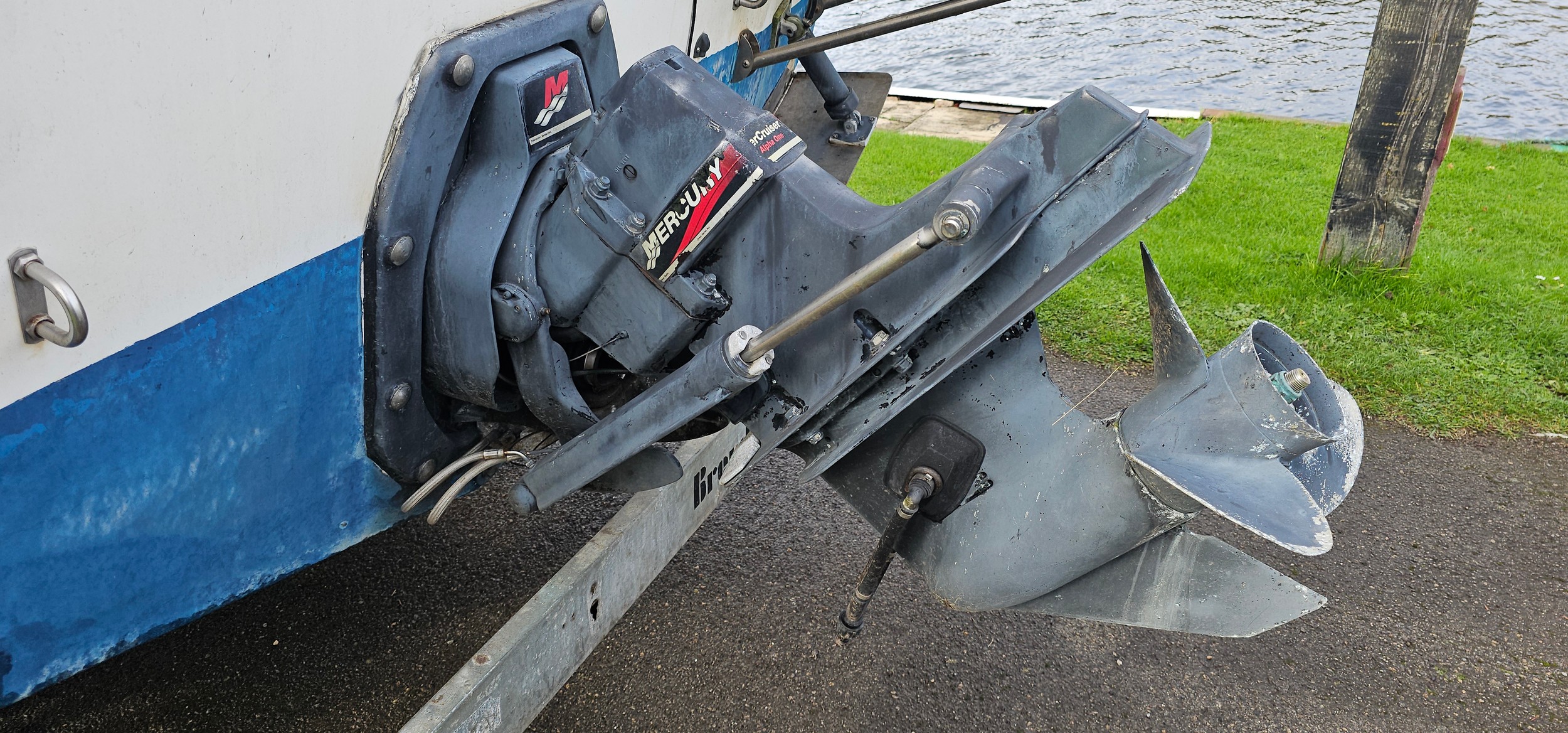 Bayliner Ciera 2655 cruiser, c.1985. Hull ID BL2B87SJA585. Four berth weekend cruiser. With inboard Mercruiser V8 engine and outdrive, 361 hours on the clock, cabin with sink facilities and heads, together with a Brenderup twin axle galvanised trailer, brakes disconnected.