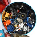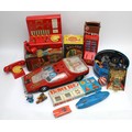 A collection of vintage toys to include a boxed tinplate 'Toy-Town' telephone exchange, a Peter Pan Chocolate machine/savings bank, a tin of loose Meccano parts, plastic and tinplate models, in one box.