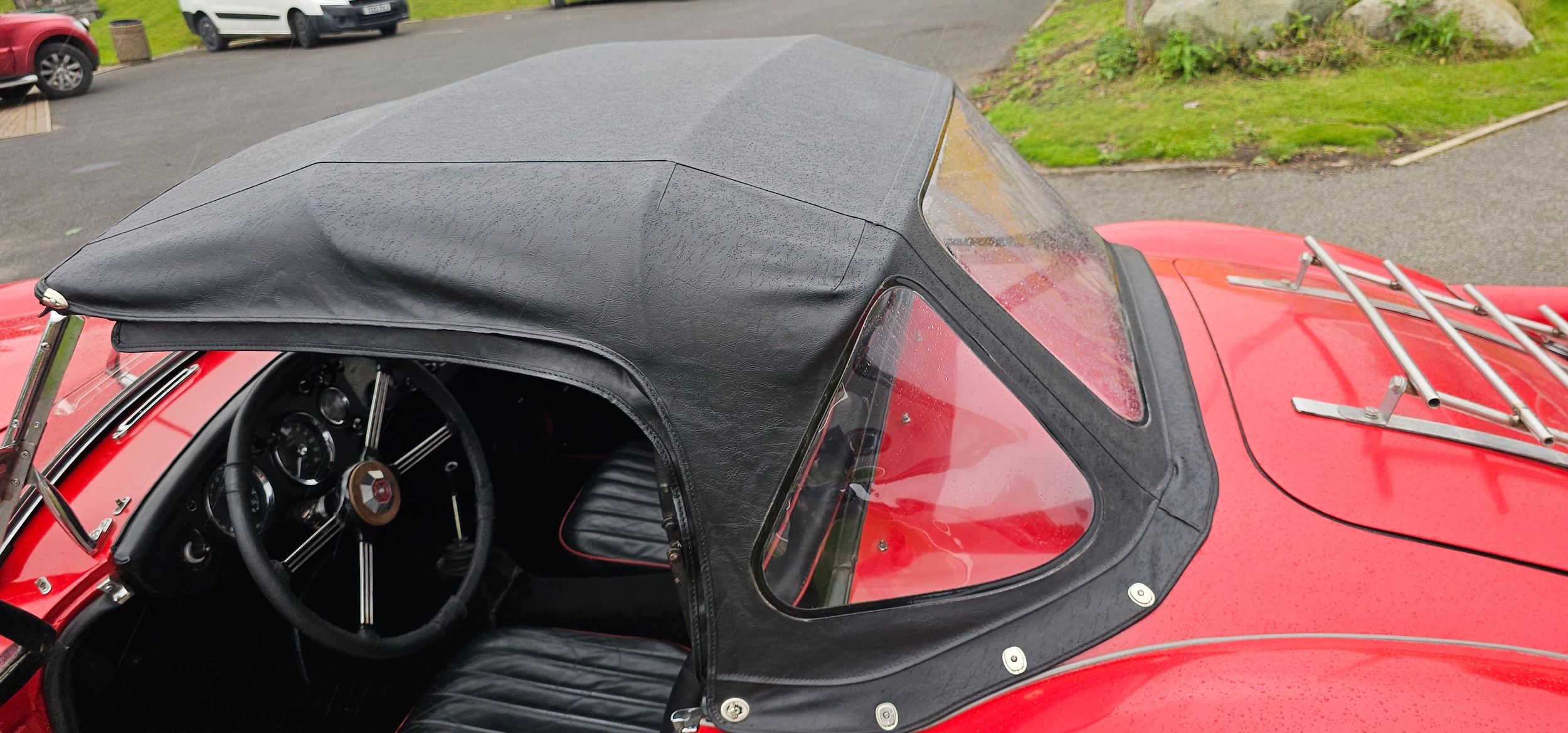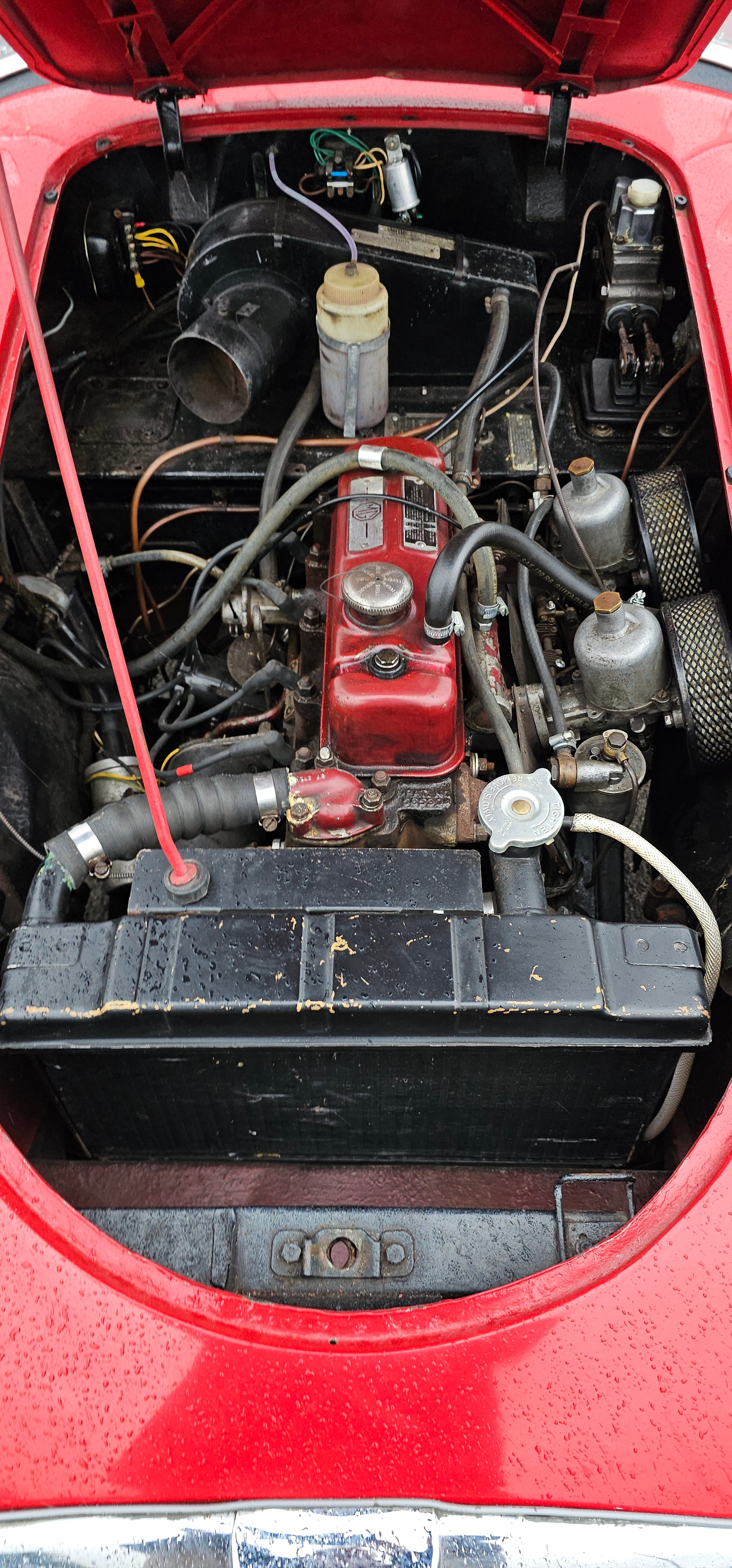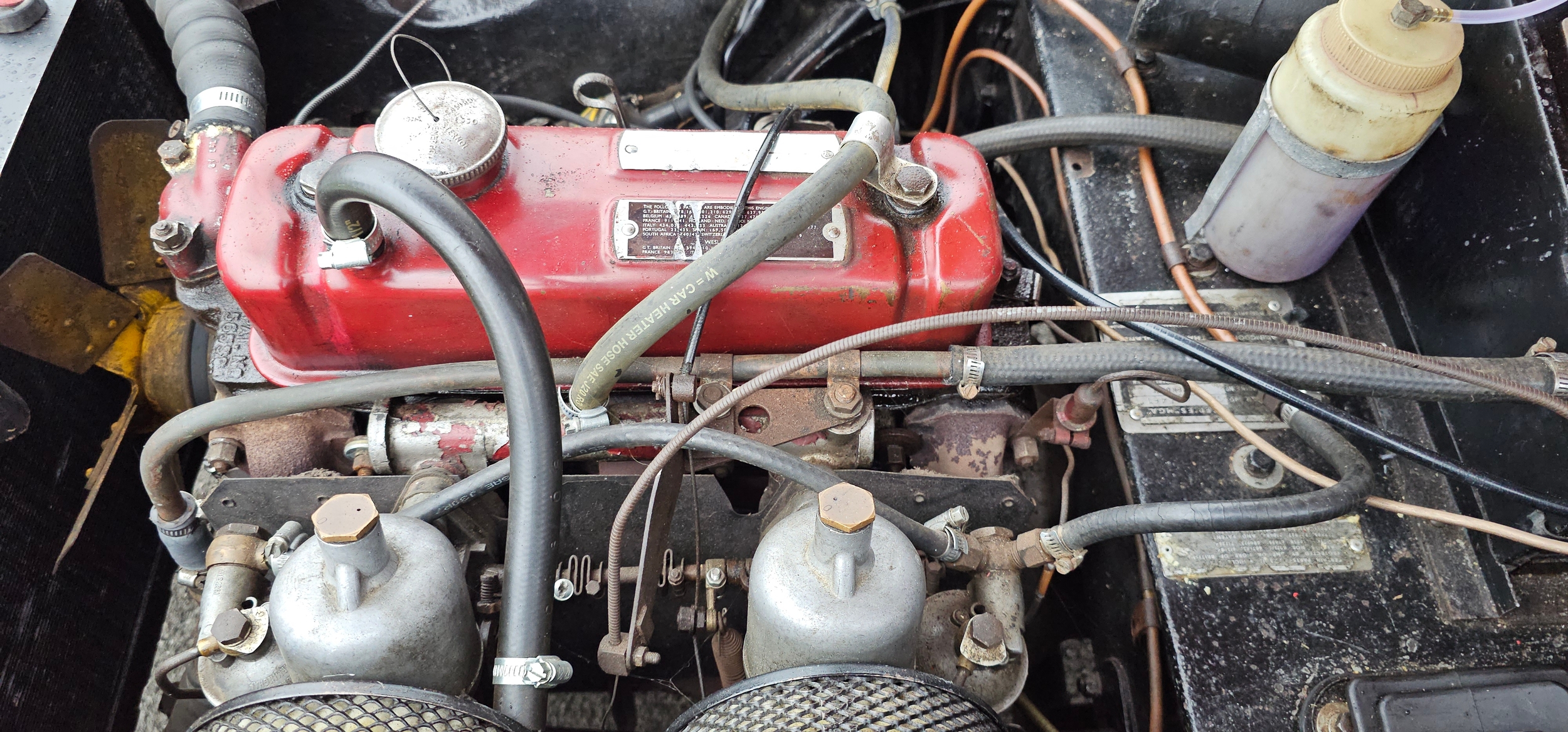 According to the accompanying Heritage Certificate UYU was dispatched form the factory on the 12th July 1960 as a black car with red interior and grey hood. It was exported to the USA and by 2005 was in New Mexico. In 2015 Stuart Skimming of Dumfries imported it and sold it to Dave Mackenzie as a restoration project. A serial restorer he took the body off, rebuild/replaced the running gear and brakes, including added a servo, the engine was dismantled and new rings and shells fitted to factory specs (the condition of the engine lead him to believe the 36,000 on the speedo was correct). A NOS radiator was fitted. The body required two patches to the lower rear wings where they meet the sills, apart from this the body is original with aluminium bonnet, boot and doors. It was resprayed Chariot Red with black leather seats and a new hood; a new speedo was fitted as were 72 spoke chrome wire wheels.