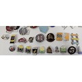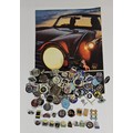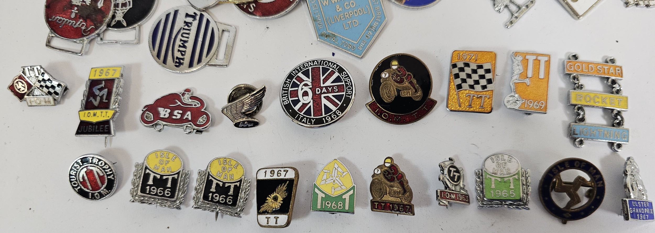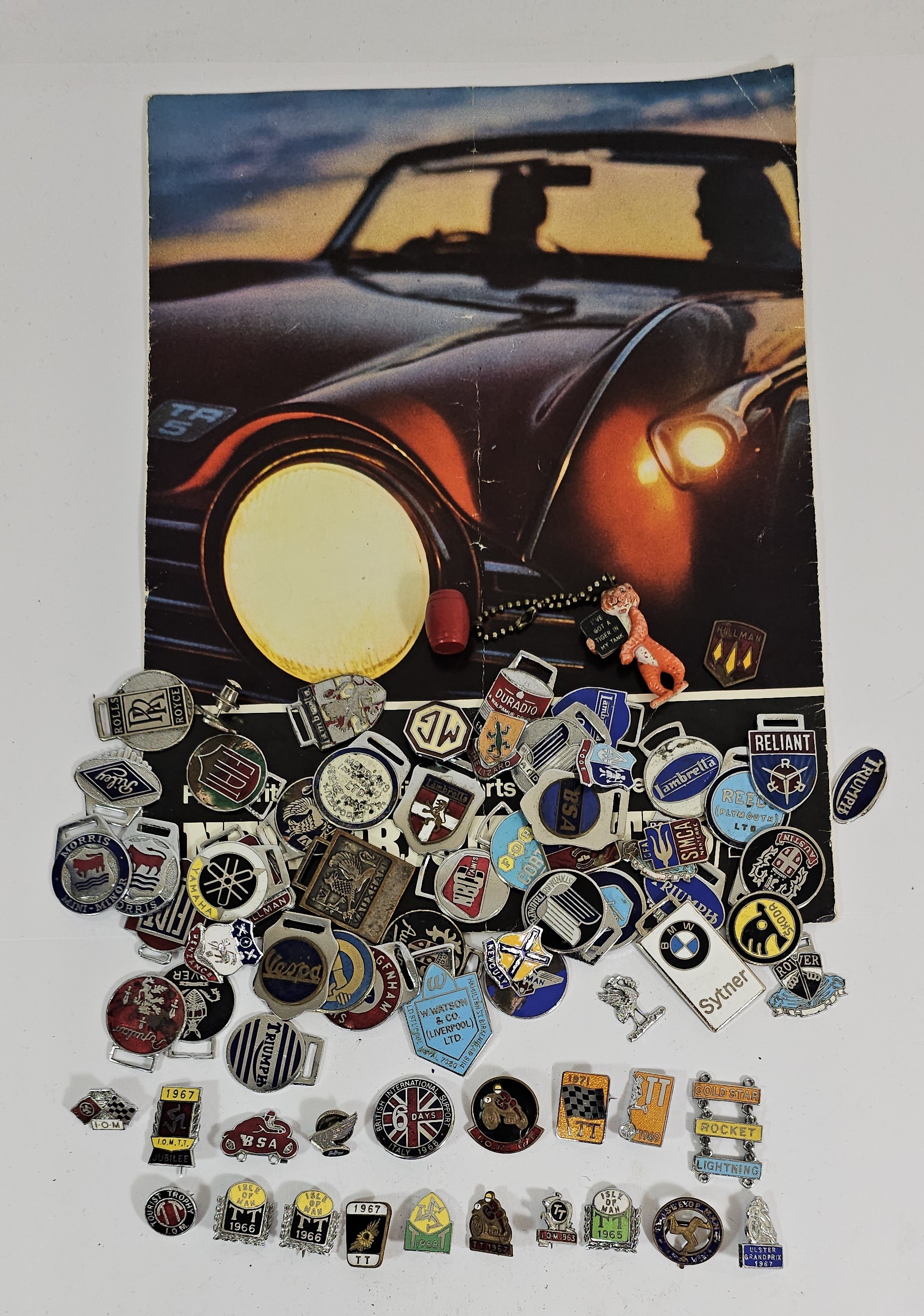 A collection of vintage car/motorcycle lapel and key ring badges, including the TT, together with a Triumph TR5/PI period brochure.