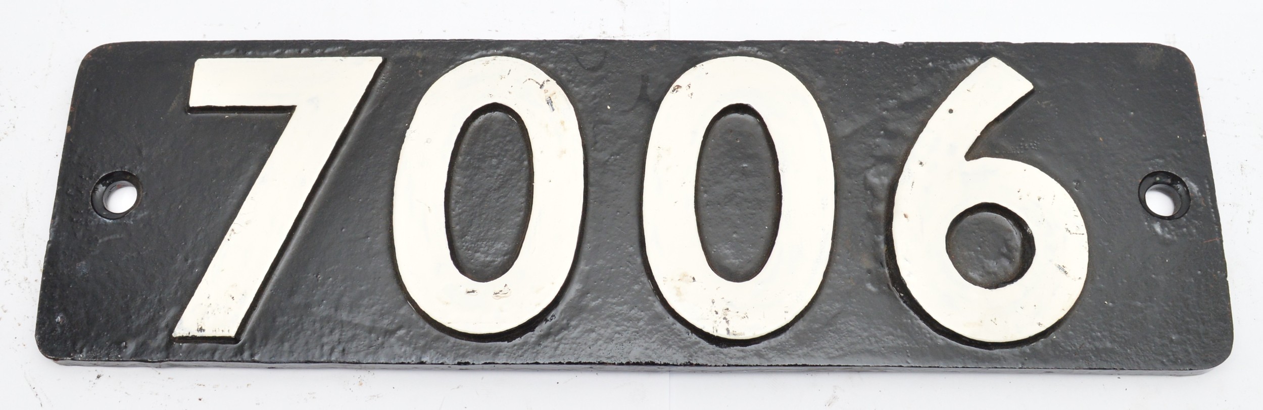 Cast-iron replica G.W.R. steam locomotive smokebox number 7006 - original carried by collett 4-6-0 castle class engine 'Lydford Castle' built 1946 and scrapped 1963, 15cm x 50.5.