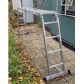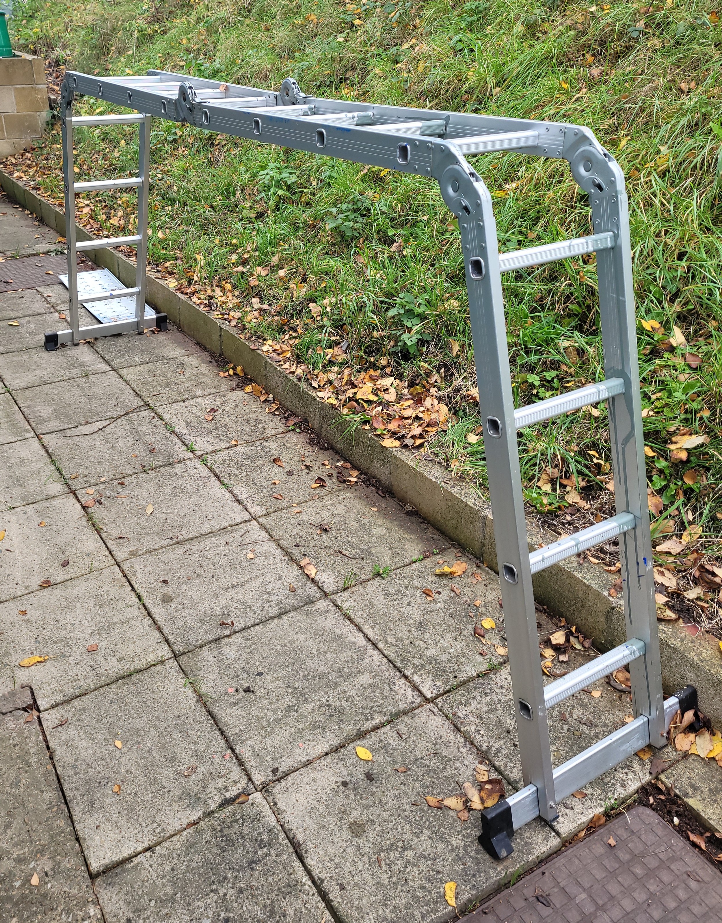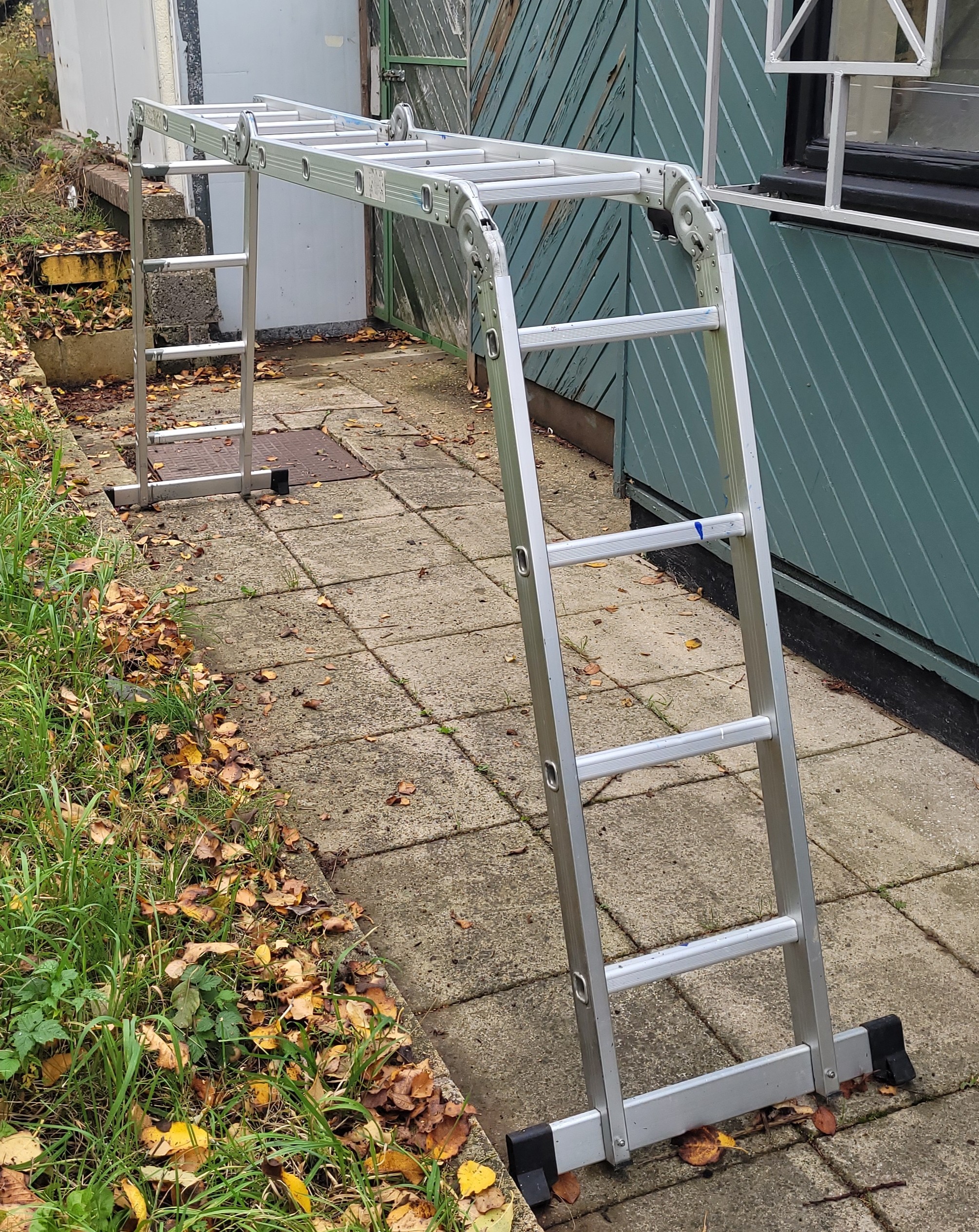 A set of aluminium folding multi-purpose ladders, with four rungs to each section, overall length 458 cm.