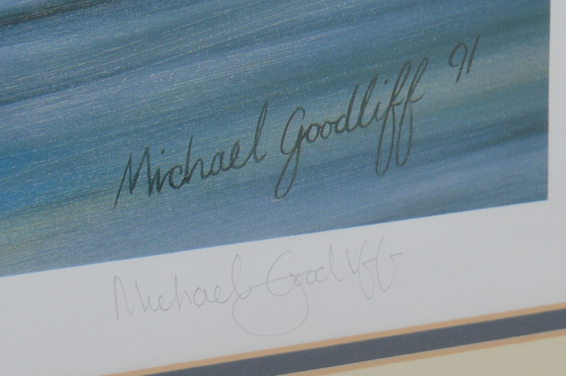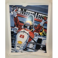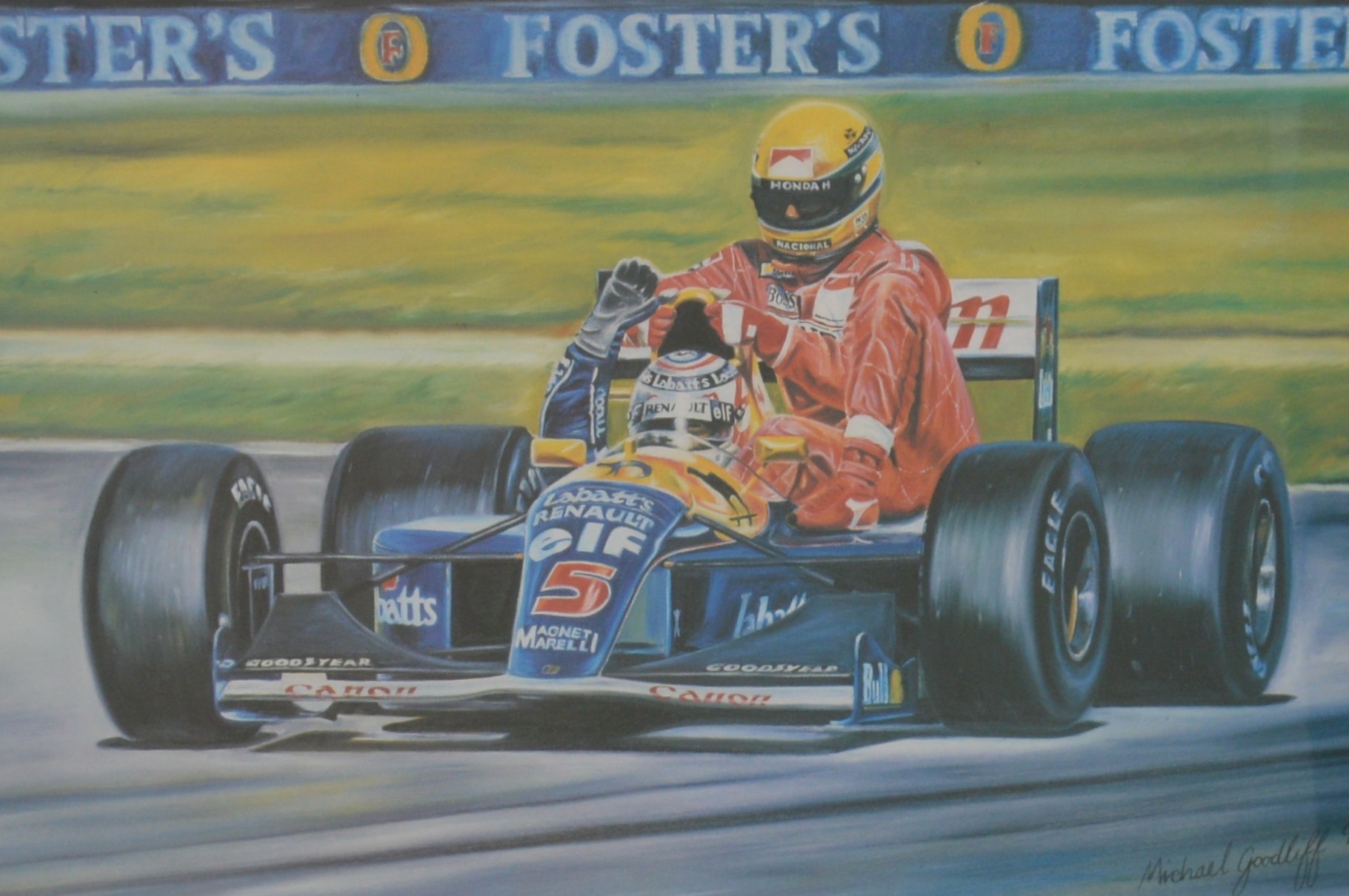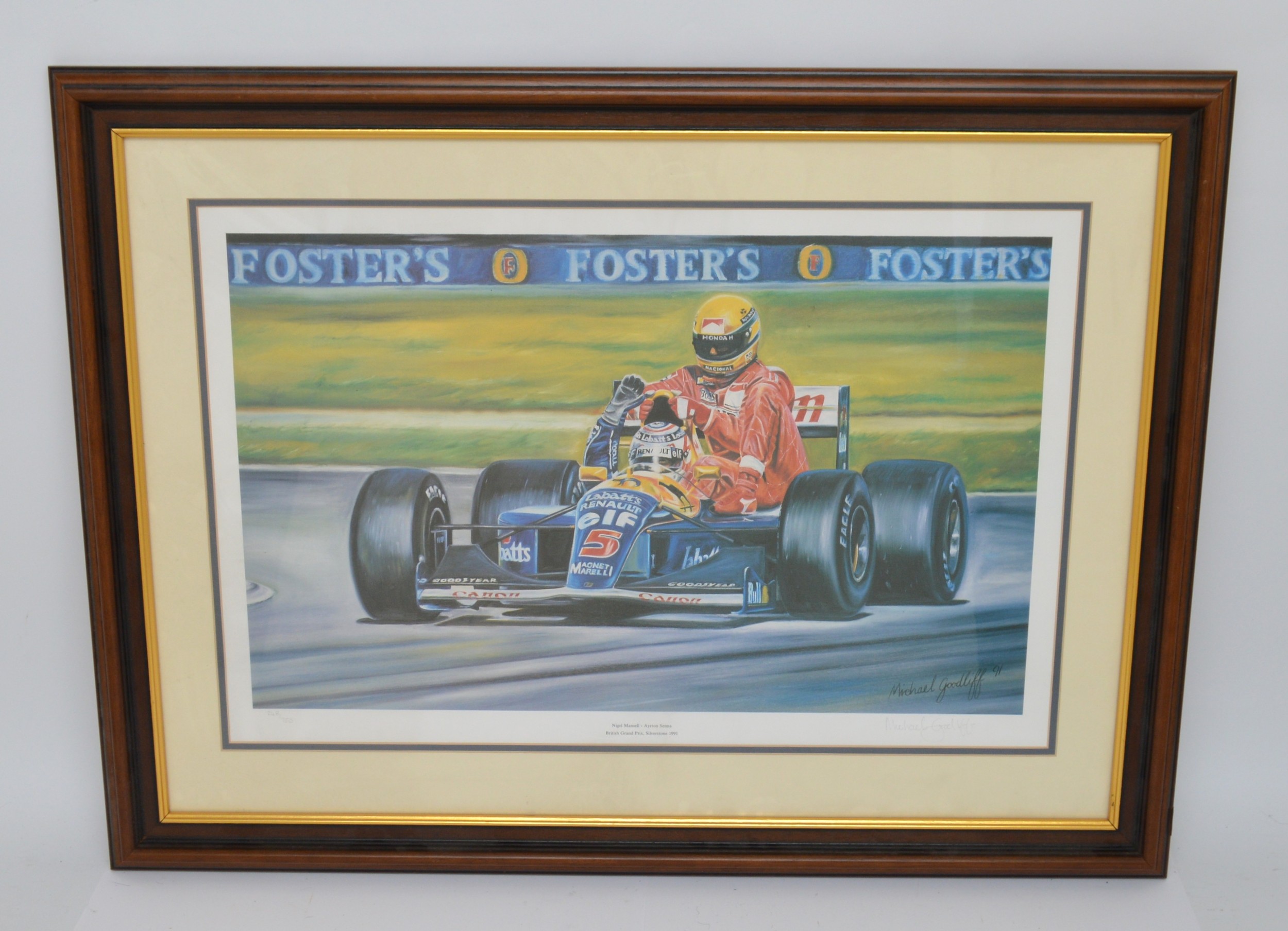 Michael Goodliff limited edition print, 248/750, Nigel Mansell and Ayrton Senna, signed in pencil by the artist, framed, overall 61 x 82.