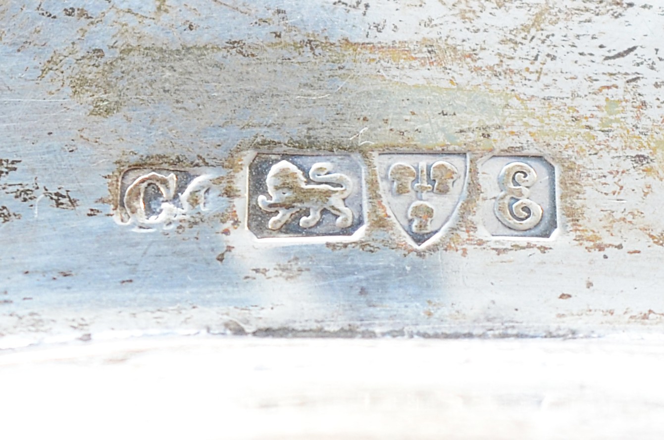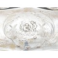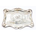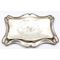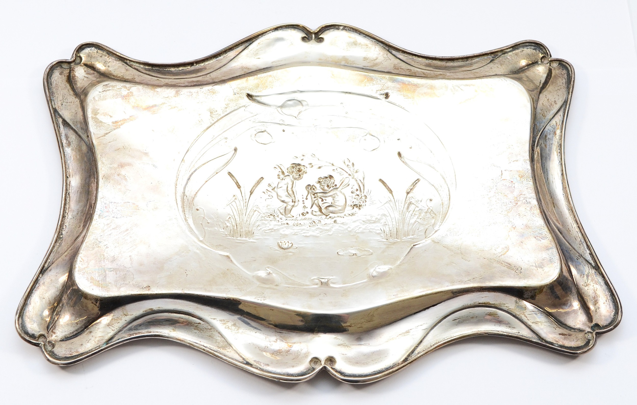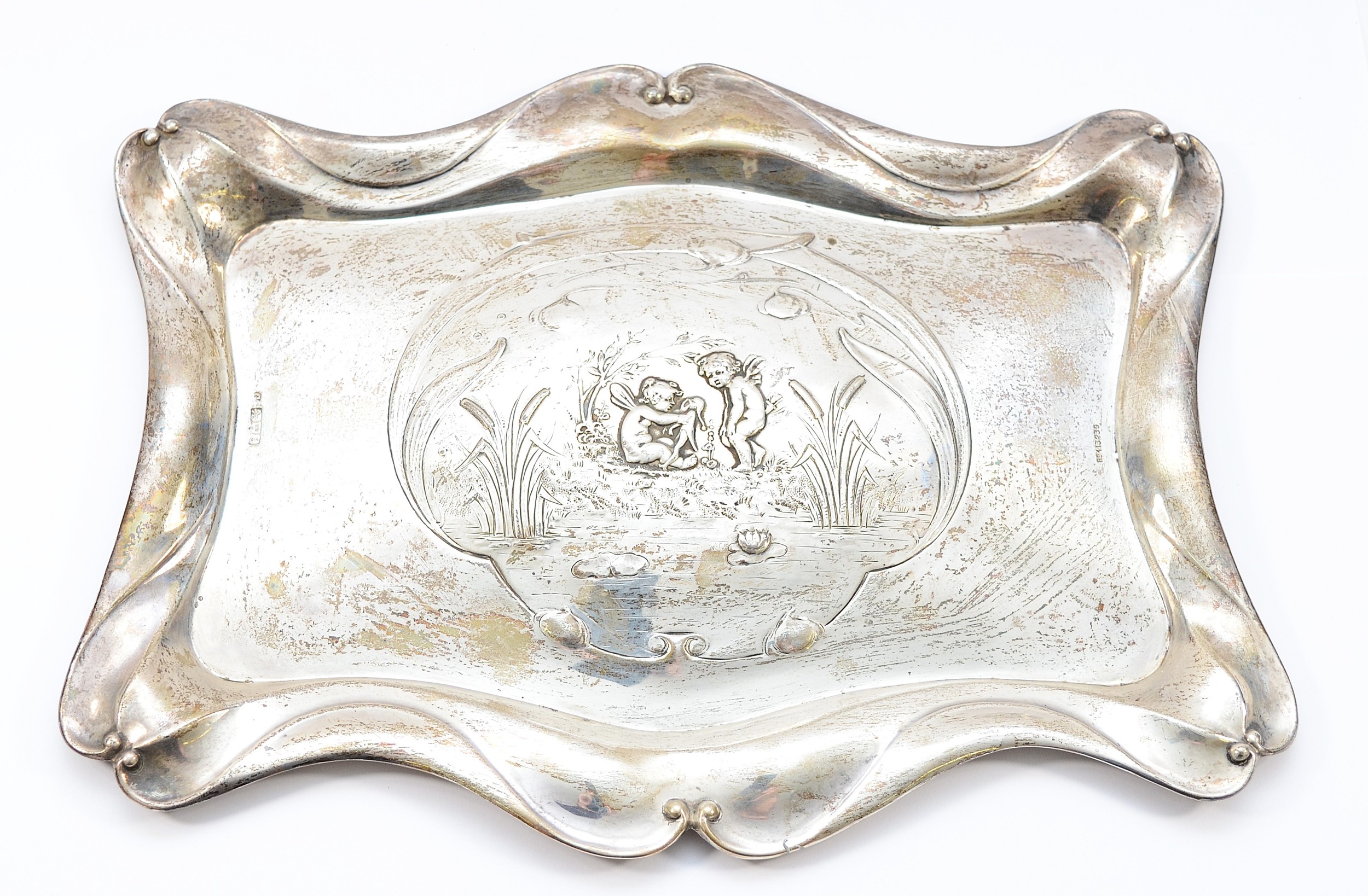 An Edwardian silver tray, Chester 1905, having serpentine border and embossed Cherub scene to the centre, 24x31cm, 383gm.