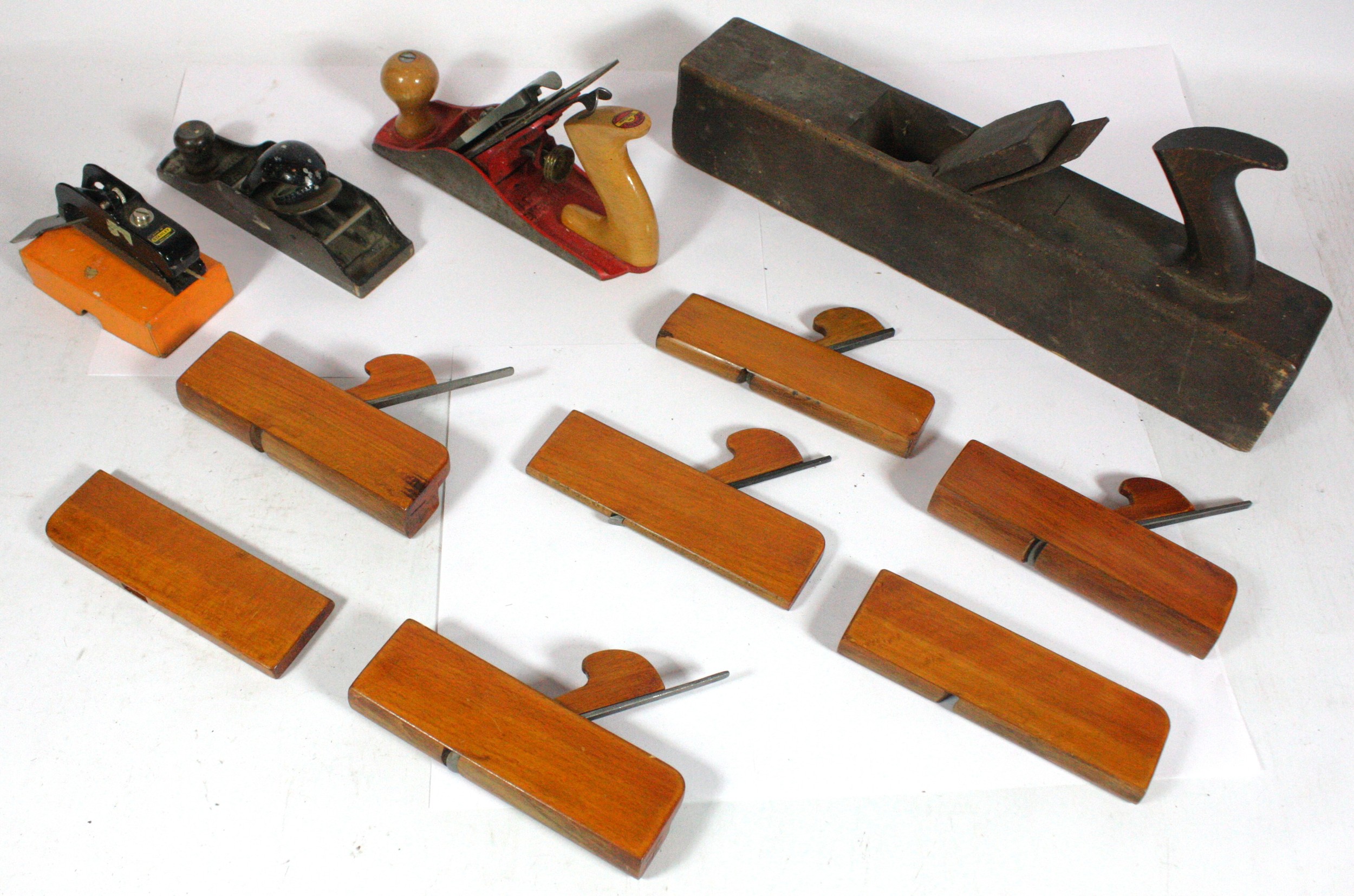 A collection of carpenter's planes, to include, an Acorn No. 4 smoothing plane, a Stanley No. 130, and a boxed Stanley 75, five wooden moulding planes, and a large wooden smoothing plane.