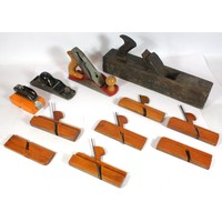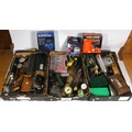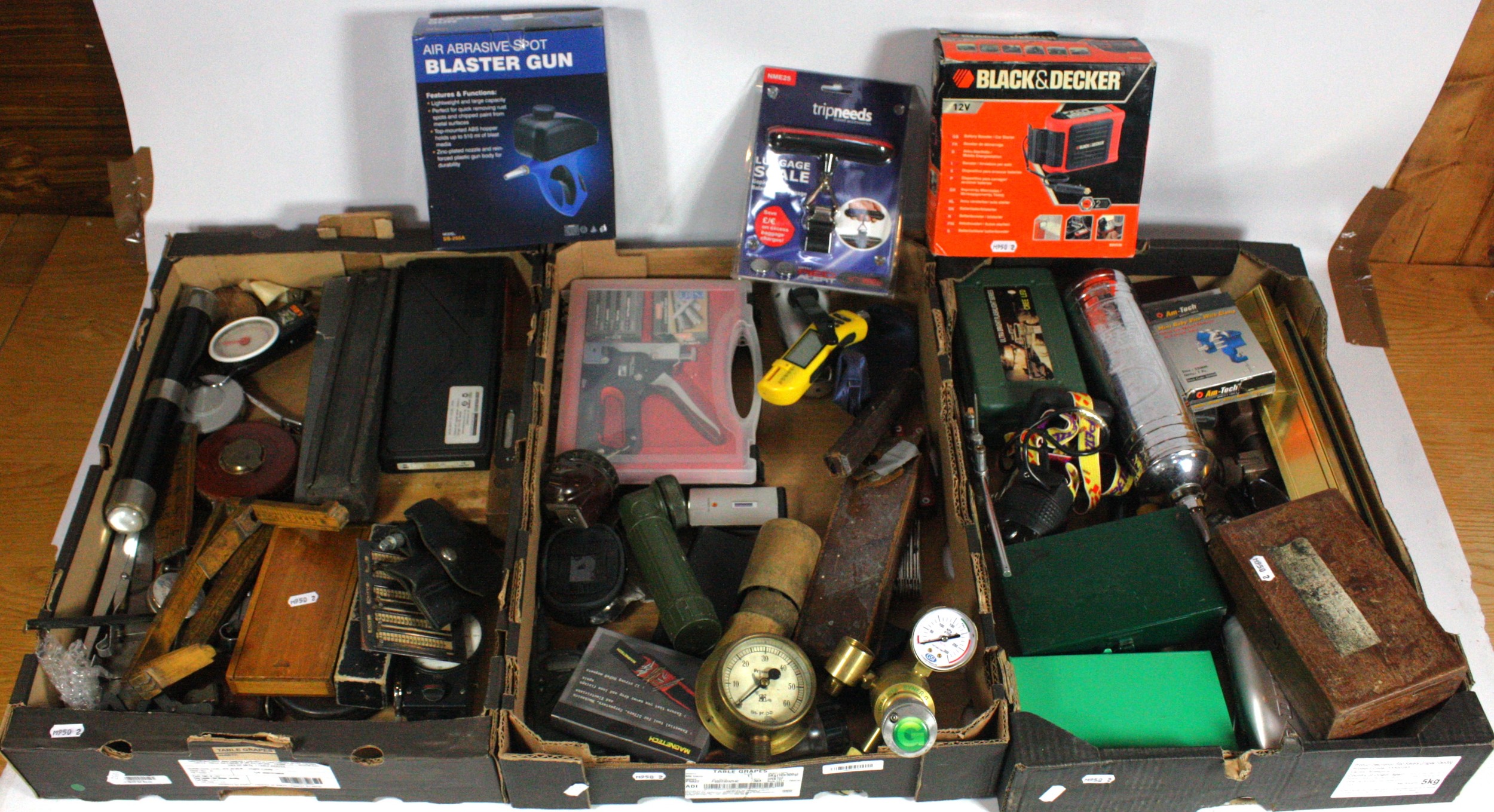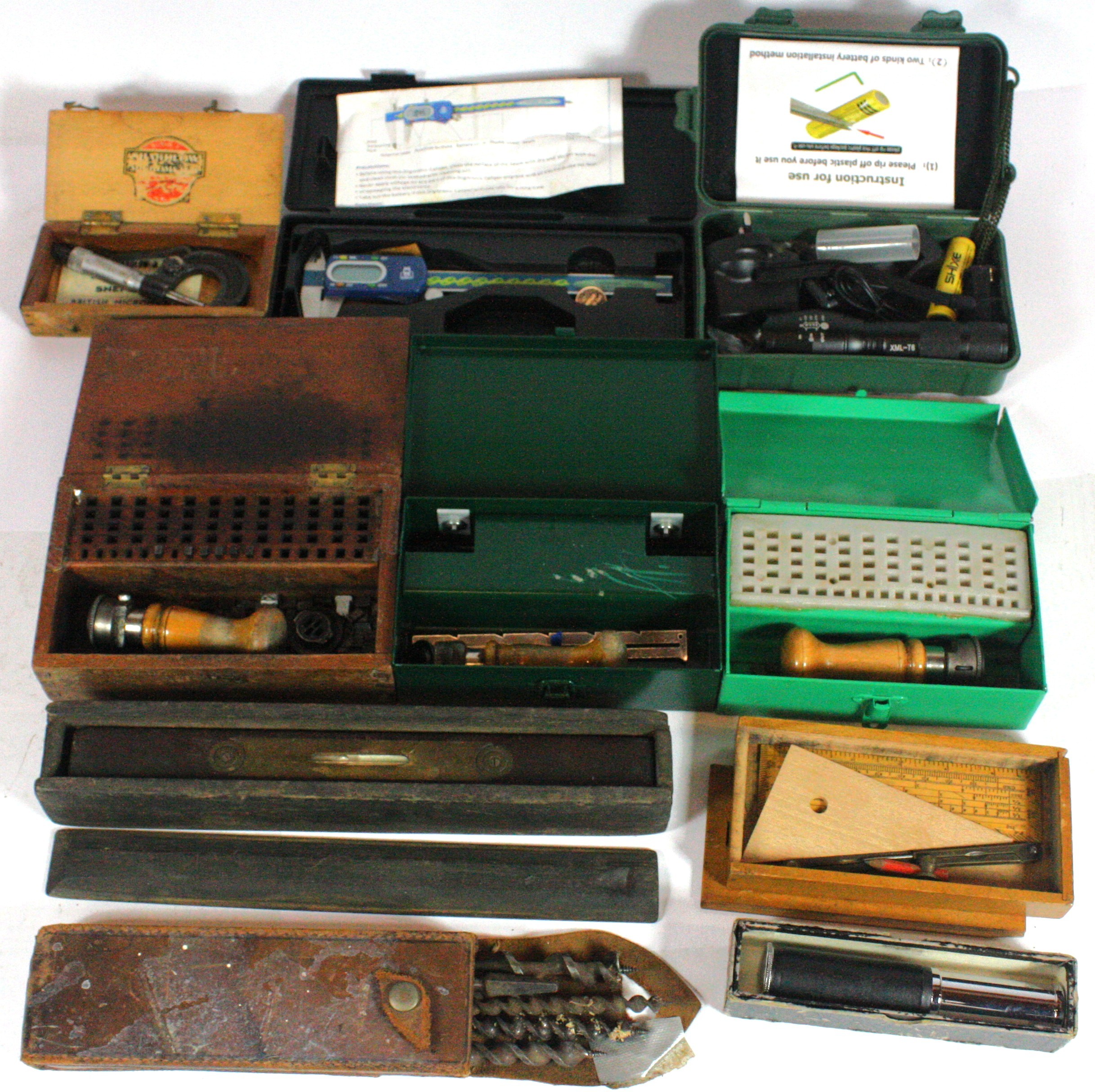 Three tray boxes of mixed tools, to include, a cobbler's foot measurer, a Watkin clinometer, a chrome plated fire extinguisher, and measuring and marking tools. (3)
